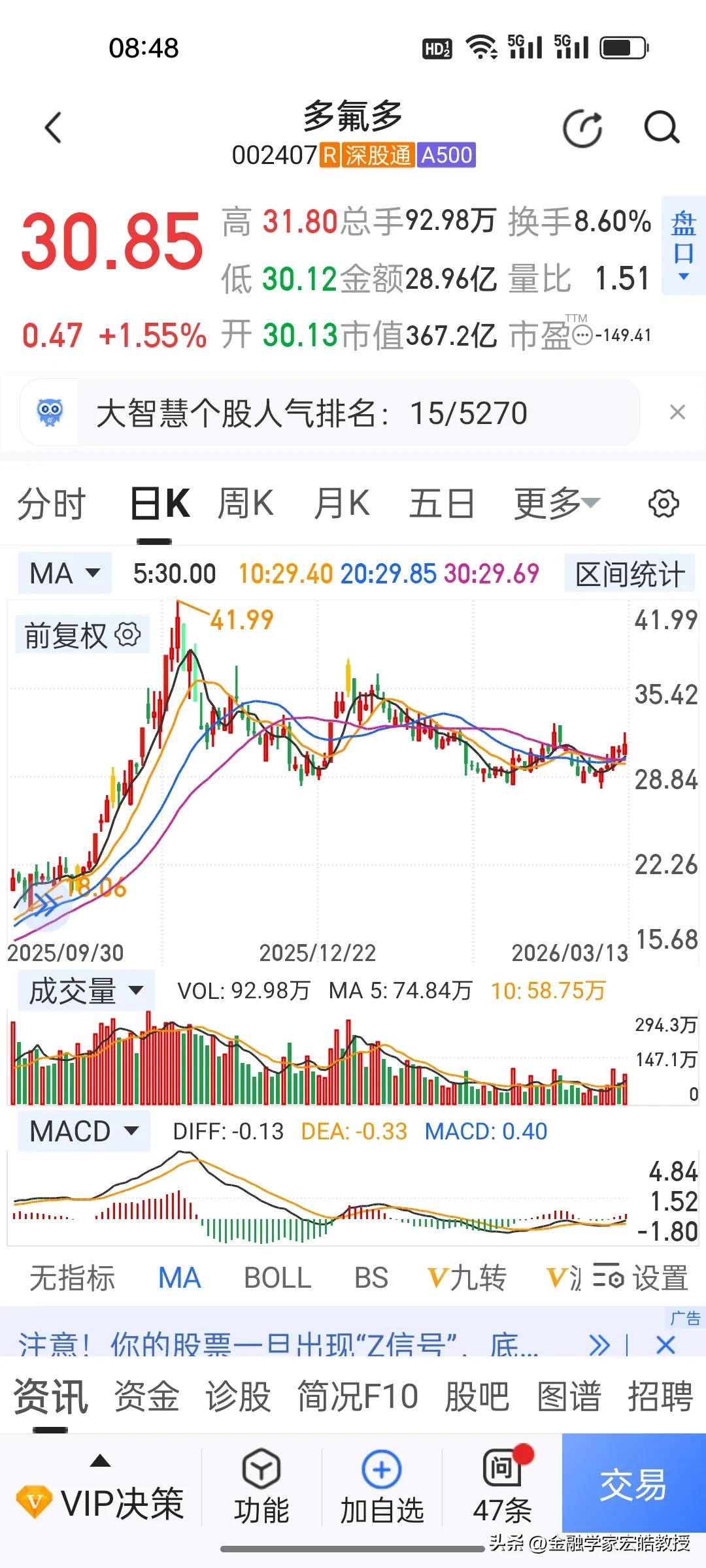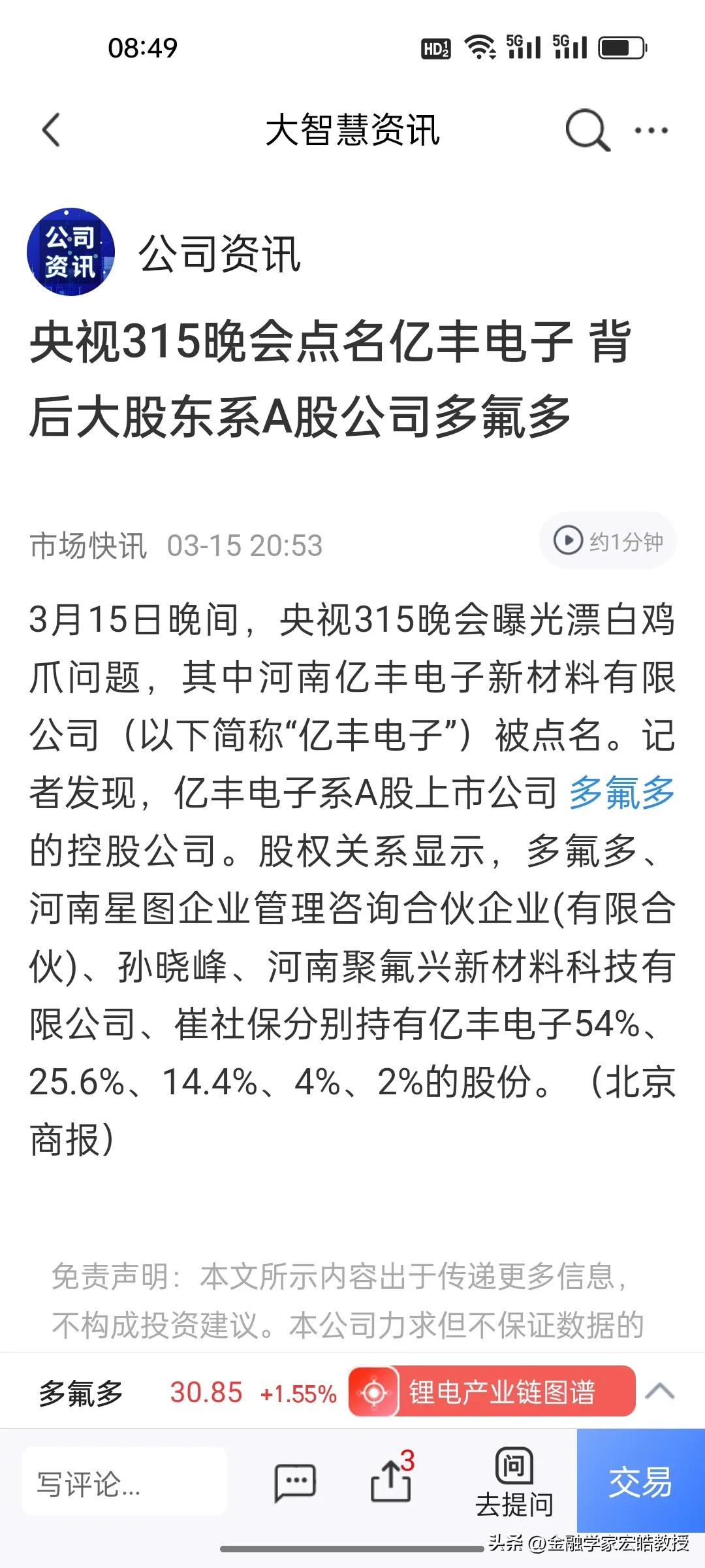 上市公司多氟多做梦也没想到,竟然会315踩雷漂白鸡爪[捂脸] 央视315曝光漂白鸡爪,控股54%的亿丰电子被冻结720万,多氟多连夜发声明切割:“亿丰电子与涉事食品厂无任何合作”,试图稳住股民情绪。 好不容易板块轮动到电池概念,股价上周五刚抬头,就撞上食品安全黑天鹅,这运气也是没谁了。 资本市场有时候短期就是情绪化的,不过这漂白鸡爪根本就不是多氟多做的,即使遭遇今天下跌波及,相信也会很快修复,毕竟在最近能影响股价的最直接原因还是年报。