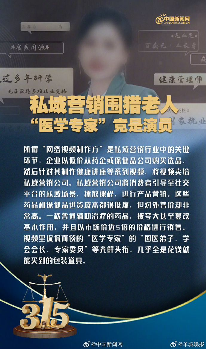 【今年315晚会它们都被曝光了】内科医生摇身一变成眼科专家卖货 荐股公司老板回应客户亏钱笑称凉拌“3·15”晚会播出,它们都被曝光了!“漂白鸡爪”生产车间令人作呕;网红神药外泌体竟是三无产品;增高机构用玄学疯狂敛财;私域营销5倍暴利围猎老人;哈啰租电动车等违反新国标;AI大模型被“投毒”;荐股分成机构成割肉骗子窝......戳图↓↓扩散给更多人!坑骗老年人的专家从演员变成真医生