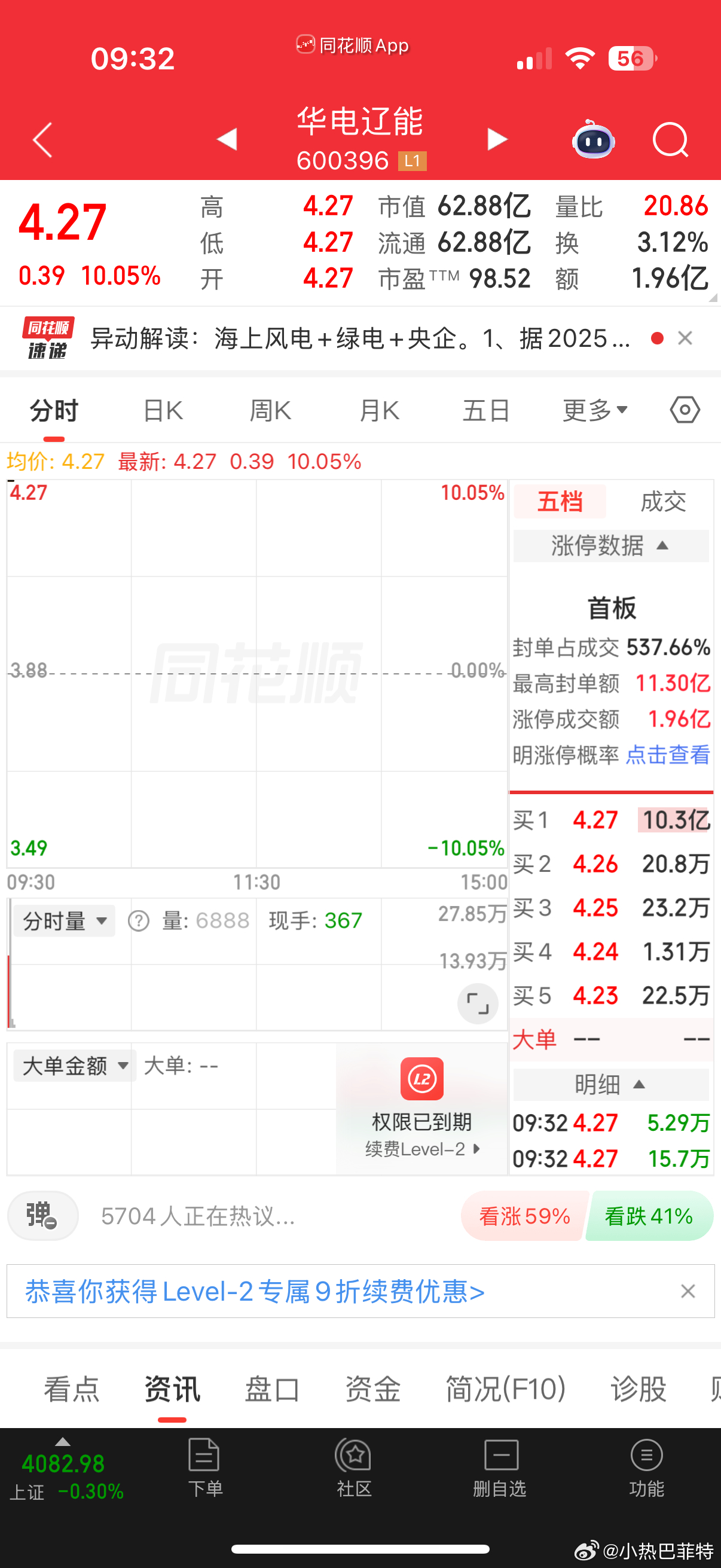 下播,$华电辽能 sh600396$ 一字板收获拿下