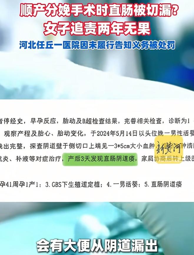 “追责到底!河北任丘,女子顺产生完孩子第3天,大便从阴道漏出,这才得知一个骇人真相:医生在进行侧切缝合手术中,操作失误,将她的直肠切漏了,术后选择了隐瞒。随即女子转院,进行了修复手术,可手术失败,她需要长期穿纸尿裤,生活几乎全毁。可让女子更气愤的是,2年下来,她花了10多万医疗费,可一分赔偿都没拿到,医院推诿,医生正常接诊。网友:这医生真的毁了别人一辈子,毫无担当,发现问题,及时修复,兴许还能挽回。 河北任丘,一名29岁的年轻女性,在一场本该充满希望的顺产手术后,人生彻底偏离了轨道。 这场看似顺利的分娩,没有带来长久的喜悦,反而埋下了一个致命的隐患,让她从此陷入了无法摆脱的痛苦与困境。 2024年中旬,李霞在当地一家医院顺利生下孩子,产后医护人员的一句“母子平安”,让全家人悬着的心落了地。 按照医院的嘱咐,李霞开始进行常规产后护理,初期下身的隐痛,被所有人归为顺产侧切后的正常反应,没人多想,也没人察觉到任何异常。 转折发生在产后第三天。 当天,李霞发现身体出现了一种无法言说的异常,粪便竟从阴道不受控制地溢出,伴随而来的异味让她陷入了巨大的羞耻与恐慌。 这种从未预想过的状况,让她瞬间崩溃,家人也在慌乱中,带着她找到当初为她接生的医护人员。 一番追问之下,当初负责侧切缝合的医生才松了口,道出了一个被隐瞒了三天的秘密。 原来,在缝合侧切伤口时,他出现了操作失误,不慎将李霞的直肠切破,形成了直肠阴道瘘。 而这个失误,他没有第一时间告知患者及家属,也没有采取任何紧急补救措施,而是选择了刻意隐瞒,任由病情悄然恶化。 病情已经不容拖延,李霞的家人放弃了与医院的当场争执,优先带着她辗转求医。 他们先去了沧州市中心医院,却因李霞的伤口已经出现重度感染,被医院告知无法接收治疗。 无奈之下,一行人又紧急赶往天津的医院,才勉强控制住了感染的蔓延。 经检查,李霞的直肠下端有一个细小的瘘口,而因为错过了最佳治疗窗口,医生只能先安排她进行抗感染治疗,待炎症消退后,再进行修复手术。 这一治疗,就持续了整整一年。 这一年里,李霞不仅要忍受漏便带来的羞耻,还要应对反复发作的阴道感染,饮食被严格限制在无渣流食,长期的营养不均衡,让她还患上了风湿病。 两年时间里,李霞一家为了治病,前前后后花了十多万元,所有费用都要自己承担,涉事医院从未支付过一分钱赔偿。 2025年,炎症终于得到控制,李霞接受了直肠阴道瘘修复手术,但手术最终以失败告终。 医生明确表示,由于瘘口位置特殊,加上前期延误治疗导致组织受损严重,后续再修复的可能性微乎其微,她将终身需要依靠成人纸尿裤生活。 这两年,李霞和家人从未停止过维权。 他们一次次找到涉事医院协商,一次次向当地卫健部门投诉,但得到的始终是敷衍与推诿。 那个操作失误的医生,没有受到任何处罚,依旧在医院正常接诊,甚至在协助李霞转院后,就拉黑了家属的联系方式,彻底逃避责任。 最终,当地卫健部门对涉事医院作出了罚款5万元的处罚,处罚理由是医院未按规定书写病历、未如实告知患者病情及医疗风险,对于涉事医生的责任,却以“一案不能两罚”为由,未作任何处理。 类似的悲剧并非个例。 去年,山东一名产妇在顺产侧切时,同样被医生操作失误损伤直肠,术后医生隐瞒病情,导致产妇延误治疗,不仅花费了巨额医疗费,还留下了终身后遗症。 这些事件,都指向了同一个疑问:顺产分娩手术时直肠被切漏? 这样的失误,真的无法避免吗? 客观来说,医疗操作难免存在意外,但意外发生后的隐瞒与逃避,远比失误本身更伤人。 侧切缝合是产科常规操作,却因医生的疏忽出现如此严重的失误,事后又不及时补救,直接导致患者终身残疾,这显然是职业操守的缺失。 而医院的推诿、监管部门的轻微处罚,更是让患者的权益难以得到保障。 如今,李霞依旧被困在病痛与羞耻之中,无法正常工作,不敢出门与人接触,家庭经济也因长期治病陷入困境。 而那家涉事医院,依旧正常营业,接诊着来来往往的产妇,仿佛那场毁了一个年轻妈妈一生的失误,从未发生过。