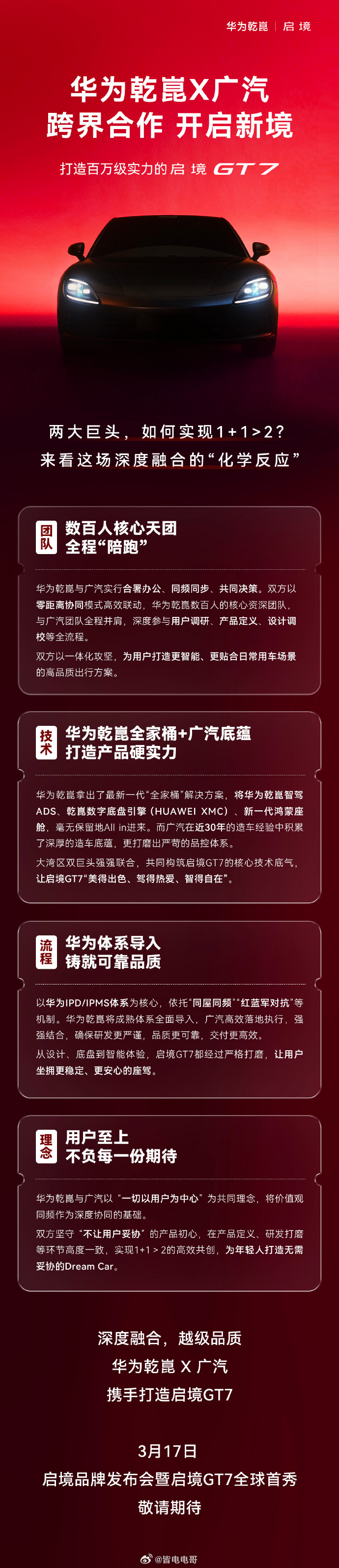 华为乾崑×广汽首款车型——启境GT73月17日全球首秀