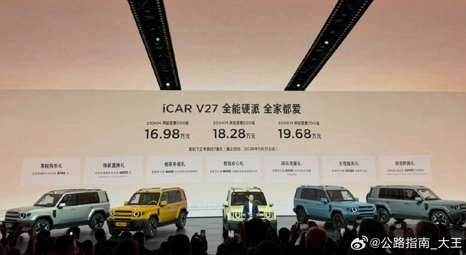 iCAR V27上市,售价16.98-19.68万方盒子造型的增程中大型SUV,车身尺寸与钛7差不多搭载34.3kWh 磷酸铁锂电池,CLTC纯电续航210km,综合续航超1200km辅助驾驶,顶配是猎鹰700+高阶智驾系统,采用地平线征程 6P 芯片,单颗算力达 560TOPS车顶有些心意,双天幕,别具一格