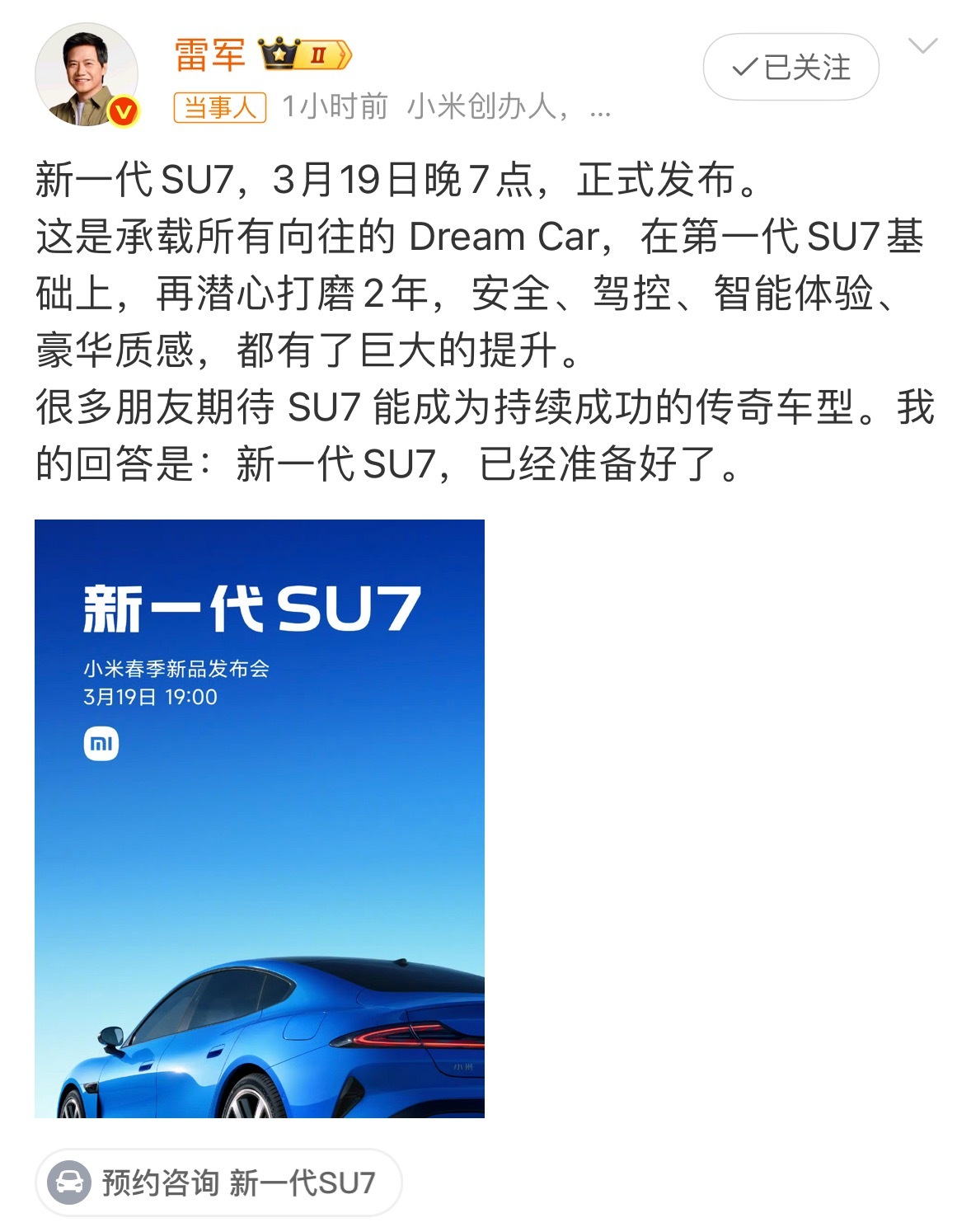 3.19也就是这周周四,大家一起见证吧。雷军称新一代SU7准备好了