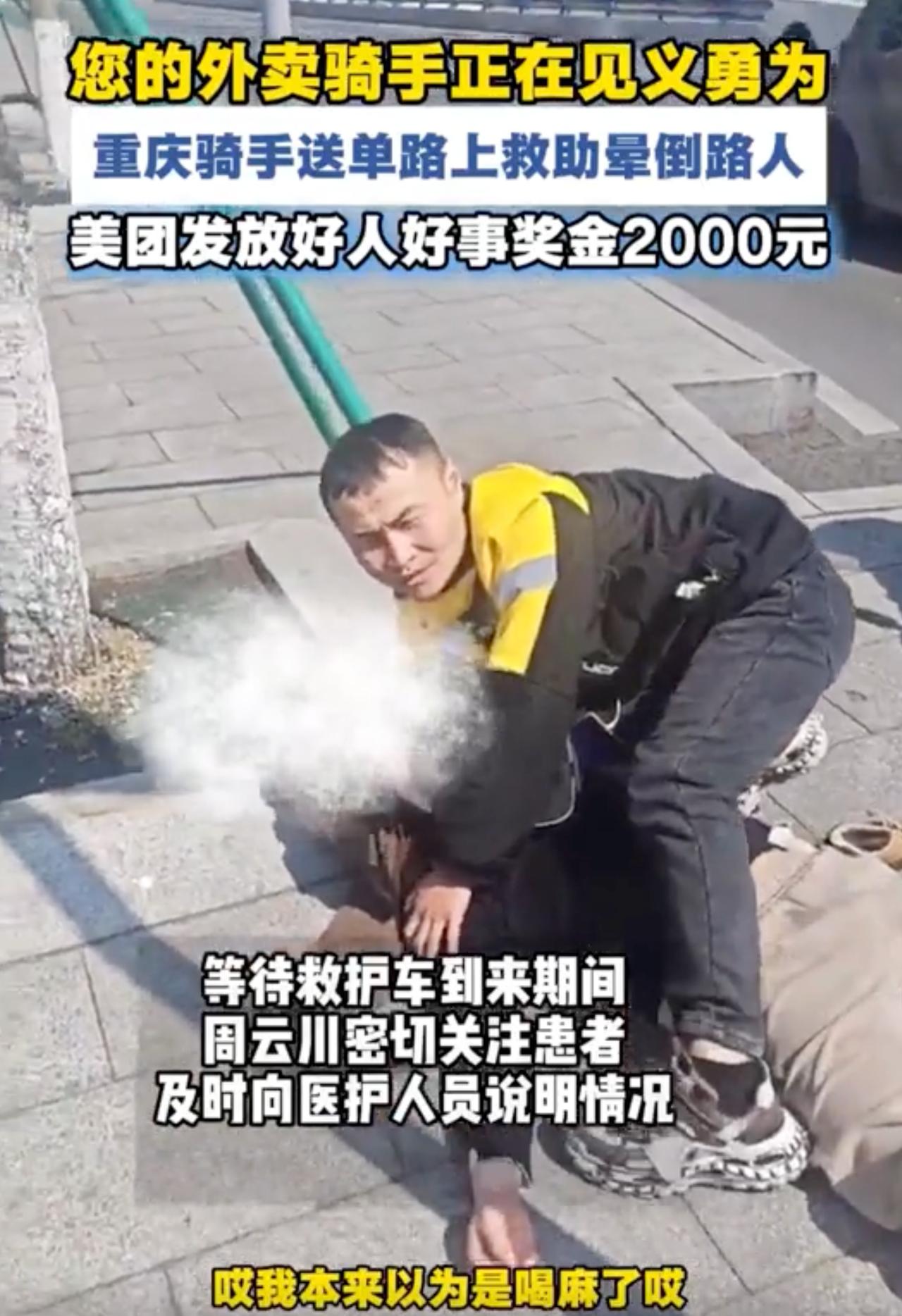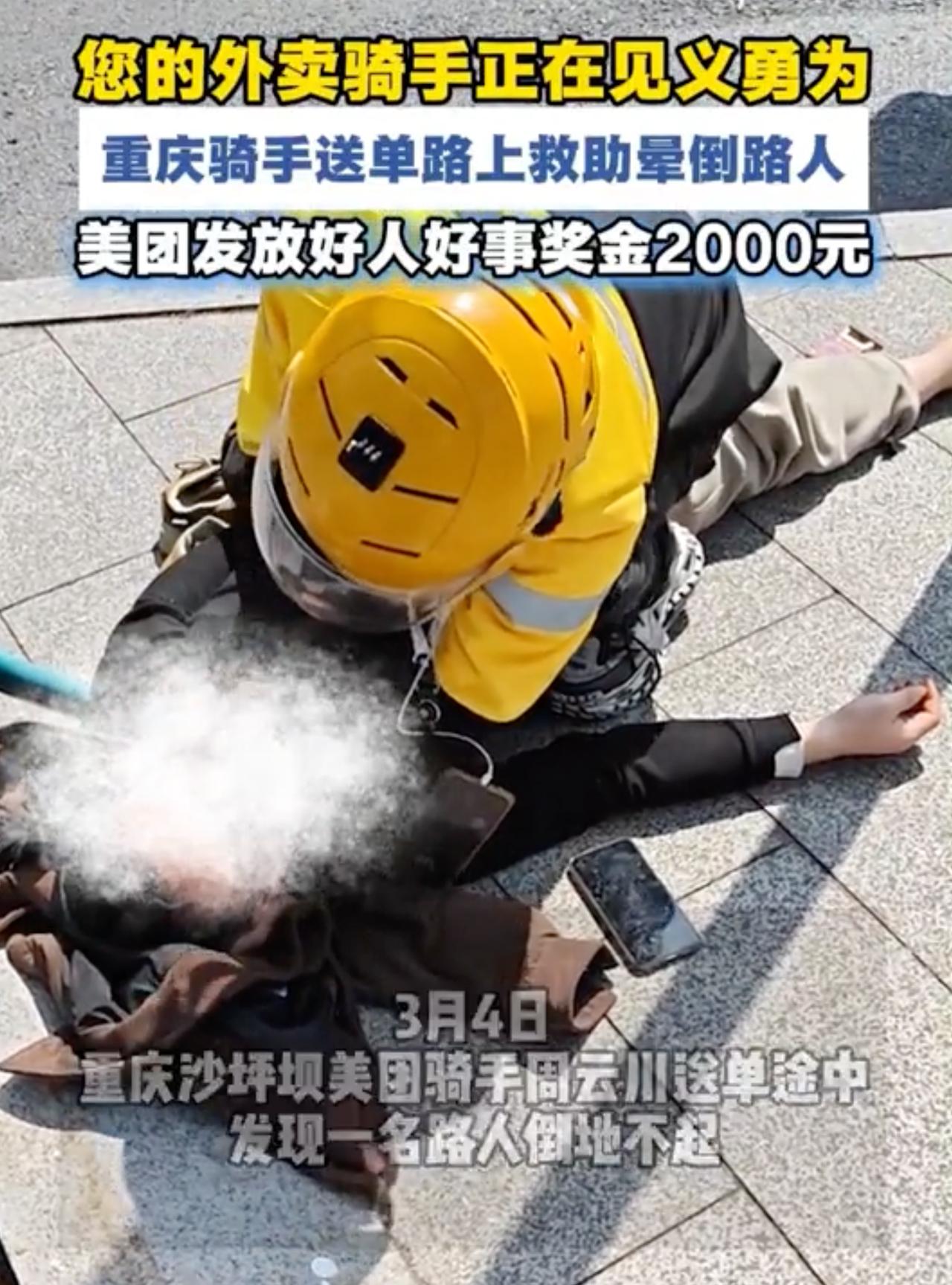 在重庆街头的车水马龙里,一个倒地的陌生人,和一单即将超时的外卖——如果是你,会怎么选? 3月4日中午,美团骑手周云川用行动给出了答案。送单途经两江新区尚文大道路口时,他看到有人倒地不起。起初以为是醉酒,走近发现对方毫无反应、呼吸微弱,他瞬间清醒:这不是小事! 他立刻拨通120,守在伤者身边寸步不离。救护车来了,他放心不下,一路跟到医院,向医生说明情况,直到确认人没事,才悄悄离开继续送单。那几单外卖,毫无疑问地迟到了。 事后有人问他,不怕被投诉吗?这个朴实的重庆汉子说得简单:“送单跟救人相比,肯定要先救人。只要人没事,一切都有意义。” 鲜为人知的是,这位暖心小哥还是一名党员骑手、跑单小队长,扎根外卖行业近5年。去年,他带头成立骑手志愿者服务队,化身“流动网格员”,给社区老人送药、排查隐患,早就把“管闲事”当成了本分。 订单可以稍等,生命不能重来。在这个行色匆匆的城市里,总有一些人愿意为陌生人停下脚步。为周云川点赞,也为每一个挺身而出的平凡人点赞! 重庆暖心瞬间 外卖小哥见义勇为