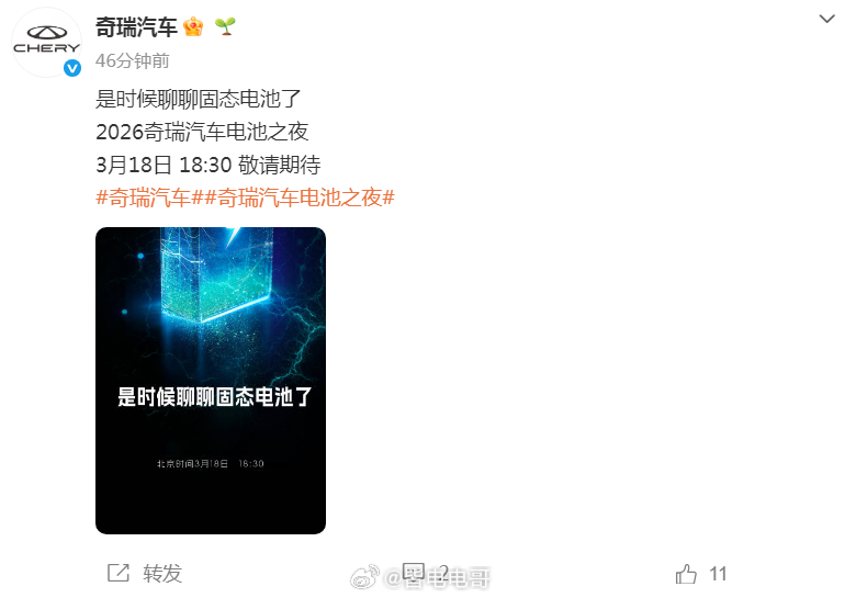2026 奇瑞汽车电池之夜定档 3 月 18 日 18:30官方宣传语就为“是时候聊聊固态电池了”