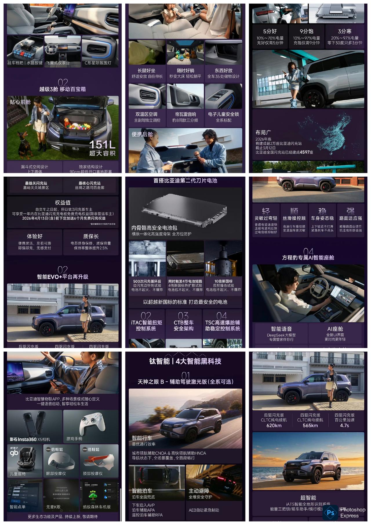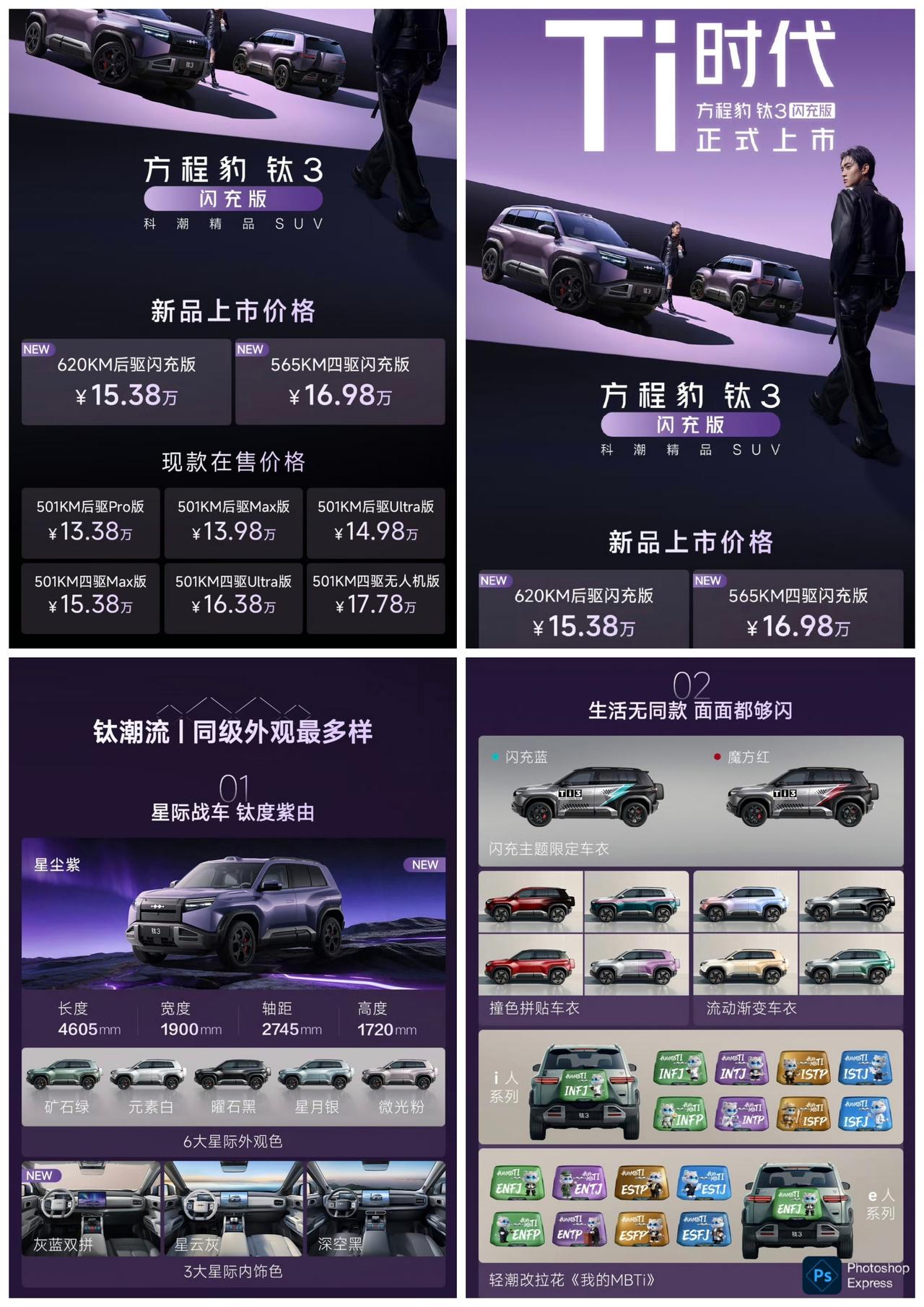 方程豹钛3闪充版,后驱620km售价15.38万元;四驱565km售价16.98万元,都可以选装激光雷达。 闪充版主要的变化就是,换成了第二代刀片电池,5分钟可以从10%充至70%,9分钟从10%充电至97%,从0%充至97%在10分钟多一些。充电速度更快了,然后续航提升。 闪充版还有方向盘加热,前排座椅通风加热都是标配,HUD也是标配,两个版本配置都挺强的,个人感觉还不错。 当然,如果对价格比较敏感,那么其它版本同堂销售,也是可以选择普通版本,整体没啥大问题,毕竟是精品小车。 方程豹钛3闪充版上市15万起 2026年最值得买的A级纯电精品车 2026年必买精品车