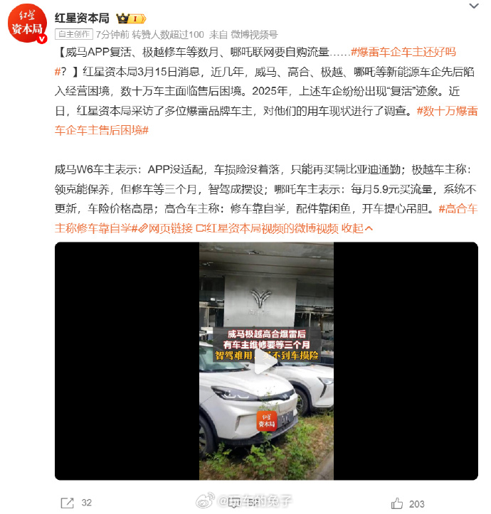 数十万爆雷车企车主售后困境 我之前的音频节目里就说过,买车的时候,尽量还是挑大厂的产品,别总盯着所谓的终身质保去买车,因为有可能这指的不是你的终身,而是这家车企的终身。那假如你是车主,怎么办?第一,能正常开就继续开。车终究是个机械产品,只要三电和核心机械结构没问题,很多基础维修其实修理厂也能解决,现在也有不少专修新能源的修理厂,可以去试试看。第二,尽量提前囤一些关键配件。比如易损件、专用件,尤其是某些品牌独有的东西,等时间过很久之后再找,价格可能会很离谱。第三,接受二手残值会比较难看。二手车市场对这类车型普遍比较谨慎,这一点其实没什么办法,毕竟二手车商也不愿意车子砸自己手里,实在不行,就等置换补贴然后去换新车。