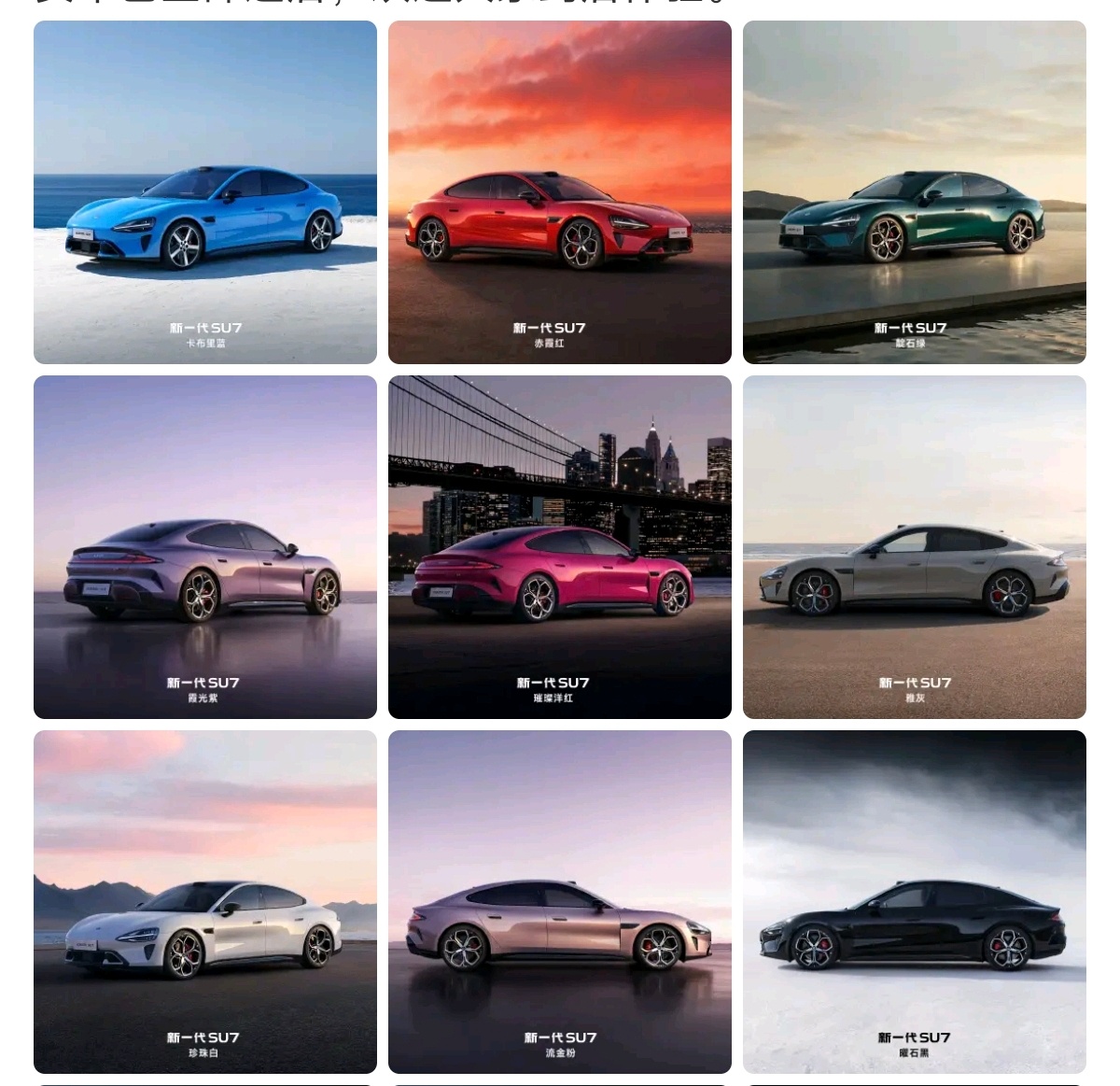 目前新SU7的9色车漆和5种内饰已经全部曝光,发布会也还剩3天,大伙儿可以提前“开会”选起来了~