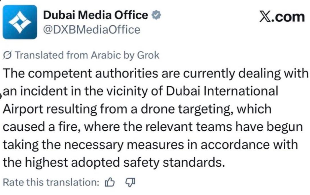 伊朗-以色列战争第17天最新进展: 据报道,一架伊朗无人机袭击了迪拜国际机场附近地区。没有进行拦截,此次袭击未受阻碍。附近可见浓烟和爆炸。 “迪拜媒体办公室:主管当局目前正在处理迪拜国际机场附近一起由无人机袭击引发的火灾事件,相关团队已开始根据最高安全标准采取必要措施。”