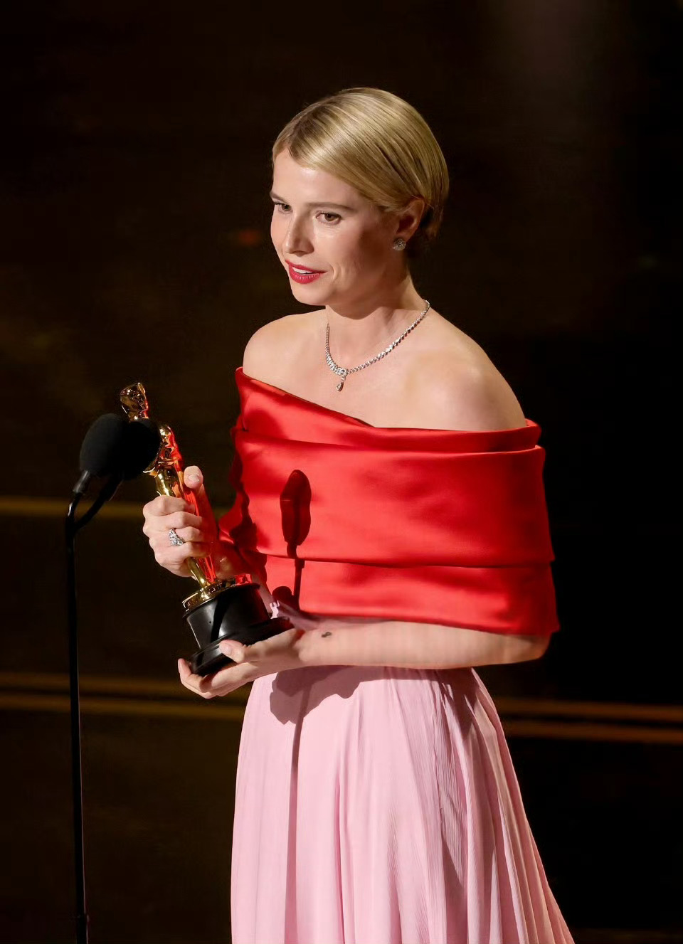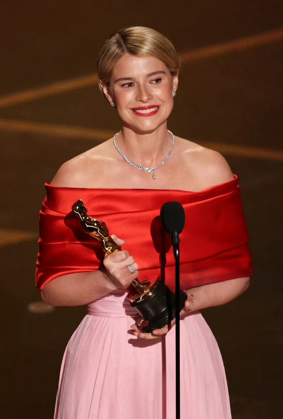 Jessie Buckley 凭借《哈姆奈特》拿下奥斯卡最佳女主角。杰西·巴克利的服装及珠宝全部由香奈儿打造,Matthieu Blazy 设计的礼服让人想到 Grace Kelly 代表的好莱坞黄金时代梦幻风情,而颈间的臻品珠宝 N°5 DROP 项链,则把香奈儿女士钟爱的数字5所代表的幸运,传递给了新科影后。