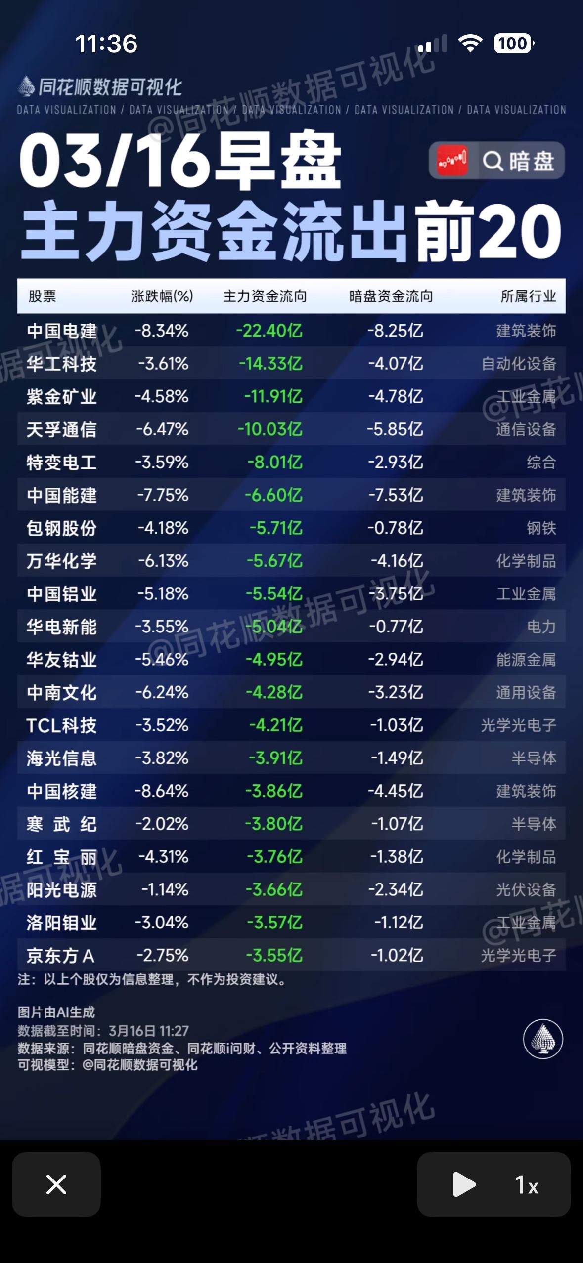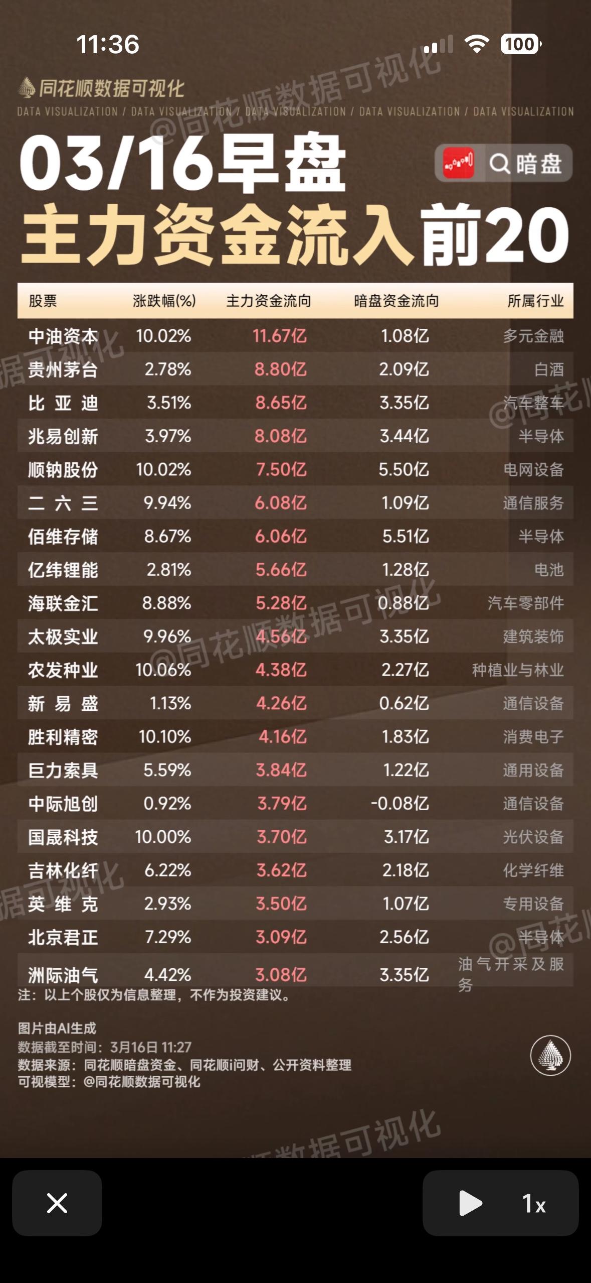 3月16日早盘主力资金流出与流入前20股,一图看懂! 3月16日早盘的主力资金流向很值得关注。从一图中能清晰看到主力资金流出与流入前20股的情况。比如资金流入前20的股票里,有些可能是因为公司有新的利好消息,吸引了主力资金入场,像某科技股可能发布了重大技术突破,主力就会提前布局。而资金流出前20的股票,或许是业绩不佳或者行业竞争加剧。比如传统制造业的某企业,面临成本上升和市场份额被挤压的问题,主力就会选择撤离。通过这张图,股民能快速把握市场动态,及时调整投资策略,在这场资本博弈中争取主动。
