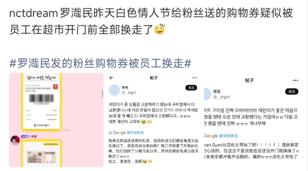罗渽民白色情人节送给粉丝的300万韩元商品券,被员工提前兑换。