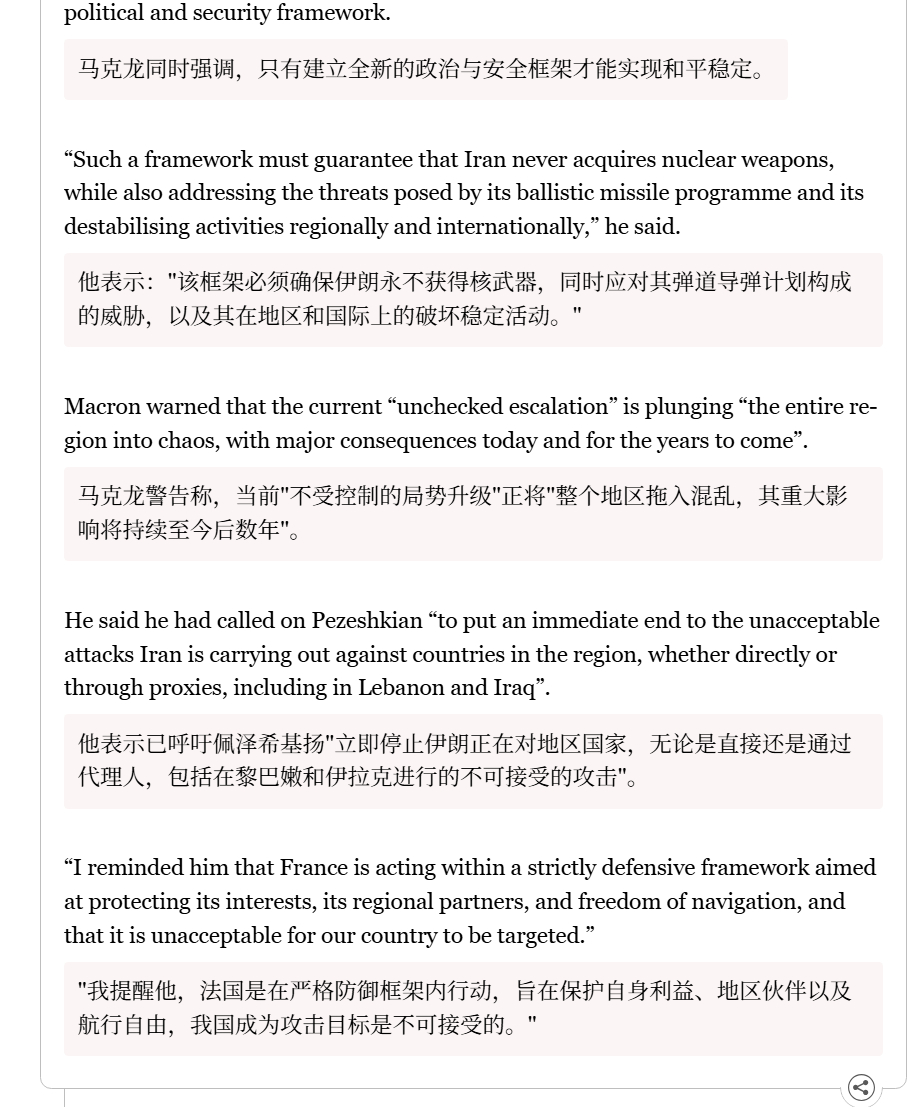 🔻马克龙说他给佩子打电话了。🔻你咋不给革命卫队打电话呢?🔻via aljanews伊朗发布战报内塔尼亚胡发视频自证在世海外新鲜事中东现场直击