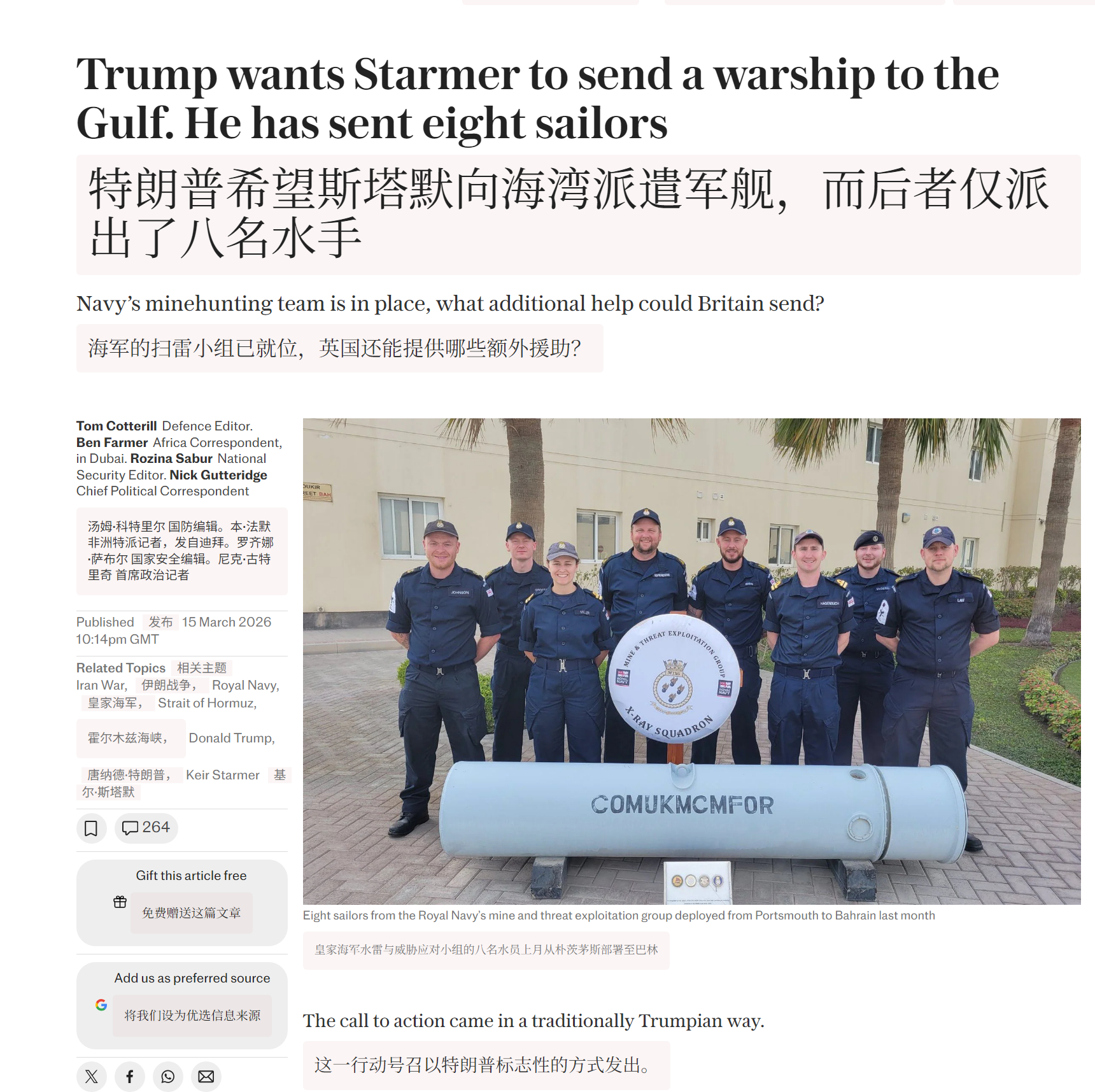 🔻英国也不是没派人。🔻《每日电讯报》获悉,英国在中东只有一支八人水兵小队能够应对伊朗在霍尔木兹海峡的水雷威胁。🔻这支来自皇家海军水雷与威胁应对小组的小分队于上月从朴茨茅斯部署至巴林(2月18日),几天后美以联合对伊朗发动了打击。🔻该小组抵达的消息在其官方账号上公布,英国国防部发布了一张八名水兵微笑的照片。"任务依旧,团队焕新,高度戒备,"配文写道,后面跟着一个炸弹表情符号。🔻一位消息人士则指出,尚不清楚这支水兵小队能采取何种行动(如果真能采取行动的话)。🔻这八个人:我吗?伊朗发布战报内塔尼亚胡发视频自证在世海外新鲜事中东现场直击