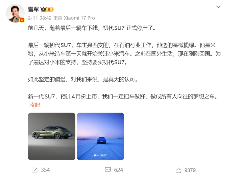 雷军称新SU7是经得起时间考验的好车 SU7最后在售的几个月,一没优惠二没分期,竞品车型也是更新了一茬又一茬。即便这样,也依旧能维持住一个月1万+的销量,近2年不更新,也依旧是2025年20万以上轿车第一,在已经告知用户即将发布新款的前提下,也依旧有车主为它买单,为情怀买单。可以这么说,SU7确实是一辆经受住了时间考验的好车。