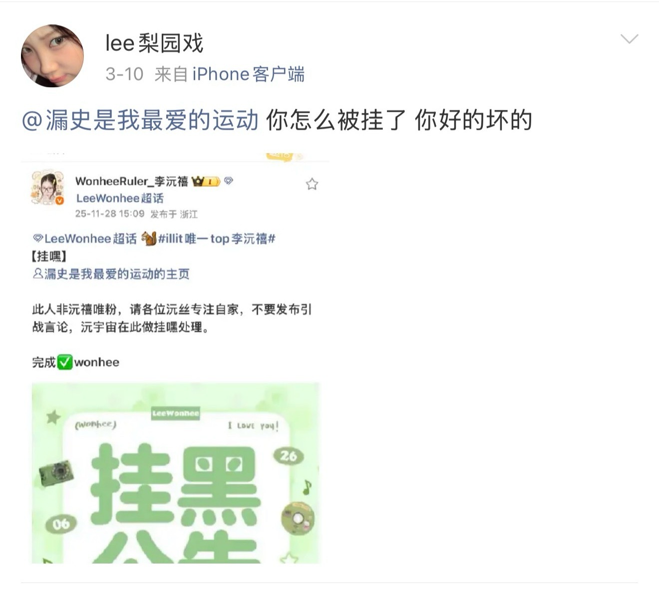 谁家有电视台帮忙拉黑人删🍎待遇啊。人家粉丝也没说什么吧,就说了句对其他播的好不