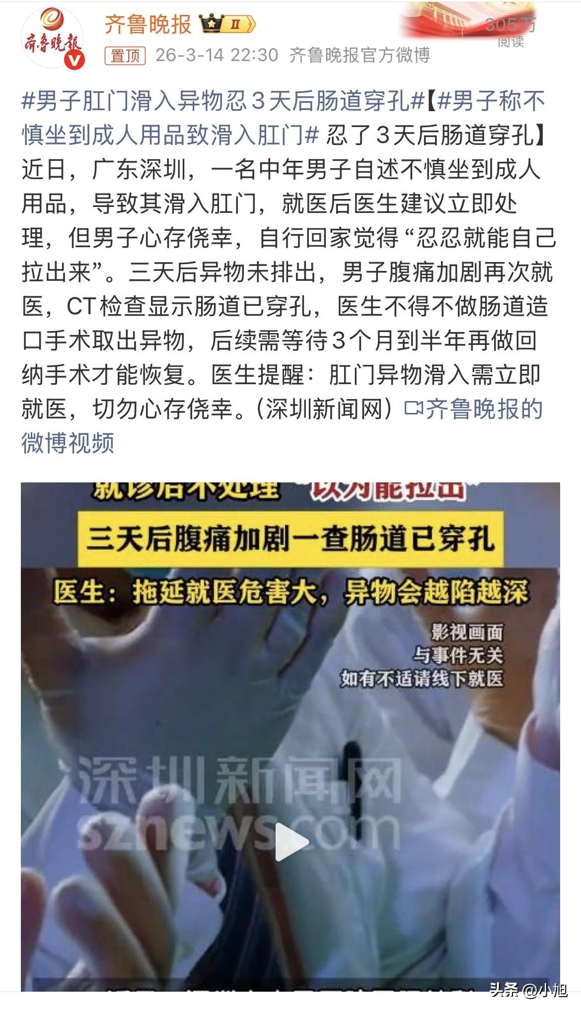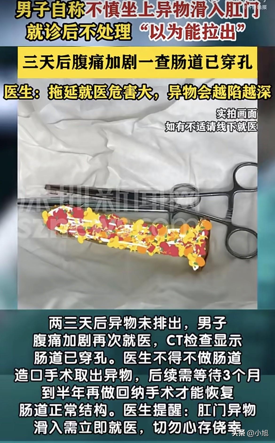 3月初的深圳,一家医院的肛肠科诊室里,一个中年男人捂着肚子,疼得脸色发白。他支支吾吾半天,跟医生说自己不小心坐到了一个东西上,结果滑进了肛门里。 医生一听不敢耽搁,让他赶紧去检查,告诉他这东西留在肚子里,必须马上处理。男人听完点了点头,转身走出了医院大门。但他没去办住院,也没交费,直接回家了。 他不是不想治,是觉得丢人。想着这么大个人了,跟医生说是坐着滑进去的,人家能信吗?他觉得医生让他做手术,是想多收钱,这东西撑死了是个物件,忍一忍,上个厕所不就拉出来了? 第二天,肚子开始不对劲了。一阵一阵地胀痛,排便的时候使不上劲,肛门像被什么东西堵住了。他还是咬牙忍着,跟自己说再等等,没准儿半夜就排出来了,犯不着挨一刀。 到了第三天晚上,整个人疼得直不起腰,满头冒冷汗,家里人看他这副样子,二话不说把他塞进车里往医院拉。这时候他连走路都得人扶着,脸色跟纸一样白。 急诊医生一看之前的记录,马上安排CT。片子一出来,医生的脸色也变了。那个东西已经不在直肠里了,它把肠道顶穿了一个洞,腹腔里有了游离气体,这说明粪便和细菌已经漏进去了。 当天夜里就做了紧急手术,医生打开腹腔的时候,肠道周围已经开始感染。异物取出来了,但那段肠子破了,没法直接缝上再用。最后只能在肚子上开了个口,把肠子拉出来接了个造口袋。 接下来三个月到半年,他得天天挂着这个袋子过日子。粪便从这个口子里直接排到袋子里,等身体恢复好了,再做第二次手术把肠道重新接回去。本来一个简单的内镜手术几分钟就能解决的事,硬生生拖成两回开刀。 网上有人算了一笔账,第一次去医院,听医生的话,几百块钱检查费加上门诊手术,几千块能解决。回家忍三天再来,急诊加抢救加开腹加造口,起步五万块,还得遭两回罪。 深圳一家三甲医院2025年的数据,接诊的肛门异物患者里,超过三分之二的人都是在家里拖了两天以上才来的,到了医院已经有四成的人肠道穿孔了。这些人里,有人吞了牙签,有人卡了鱼刺,还有人跟他一样的情况。他们不是不知道危险,是开不了口。 广州有个男的喝水吞了根牙签,也是肚子疼了两天才去,做手术的时候牙签已经扎穿了十二指肠。上海中山医院接诊过一个病人,牙签从胃流浪到小肠,肠壁穿孔,差点大出血。 那个把牙签吞进肚子的,也说是自己不小心含在嘴里喝水咽下去的。到底怎么咽的,只有他自己知道。 这个深圳的男人,出事那天在家,到底怎么就不小心坐上了,还那么巧滑进去,细节没人知道。他自己说的版本,外人也没法反驳。但有一点是真的,他第一次从医院出来的时候,脑子里想的不是穿孔,不是感染,是这事儿不能让熟人知道。 三天时间,肠子穿孔,腹腔感染,造口袋挂腰上。他用三天证明了,有时候面子比命还硬。 评论区有人说他是天才,有人说他玩得花,还有人说这种谎话骗鬼呢。大家怎么看这事?