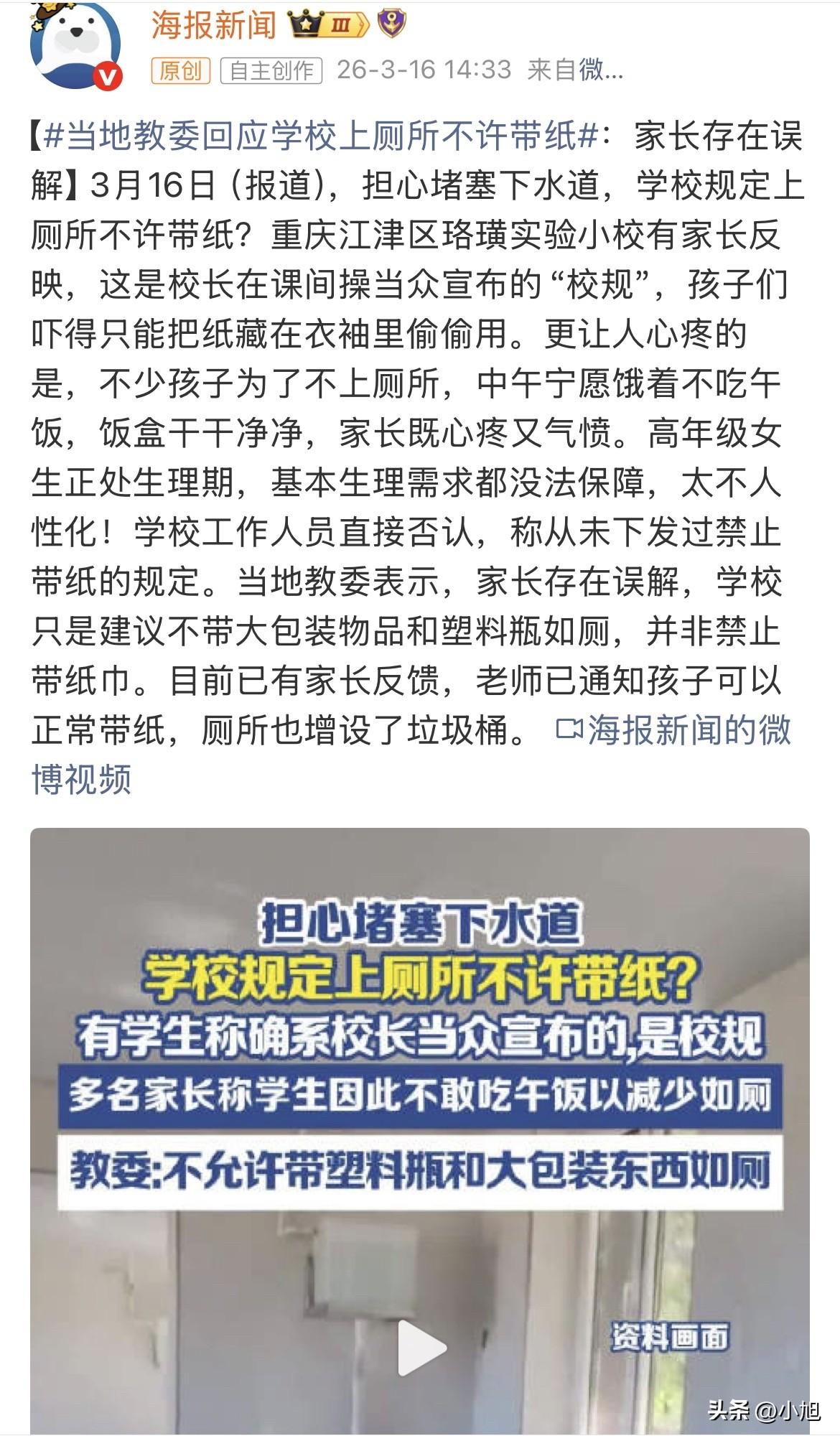 重庆一位家长晚上给孩子洗饭盒,发现饭盒干干净净的,中午根本没用过。孩子才上几天学,伙食费交了,饭却一口没吃。 家长问孩子为什么不吃饭。孩子说学校规定上厕所不能带纸,吃了午饭就想上厕所,干脆不吃了。 孩子说是校长在课间操当着全校宣布的,理由是防止下水道堵塞。谁带纸进厕所就是违反校规。当时操场上站着一千多个学生,都听见了。 家长群里炸开了锅。有家长说自家孩子为了上厕所,把纸悄悄藏在衣袖里带进去,像做贼一样。孩子说老师会检查,被发现了要挨批评。 有家长在小区里随便问了几个学生,还录了视频。孩子们都说是校长亲口宣布的,千真万确。 高年级女生家长急得不行。孩子正在生理期,不用卫生巾怎么行。有家长说难道让生理期的孩子也憋着?这太不人性化。 有家长发现不止自家孩子不吃午饭。几个家长都说孩子这几天饭盒都是干净的。孩子说班上好几个同学都这样,吃了饭就得上厕所,干脆不吃了,忍一忍就放学了。每天十块钱的伙食费全浪费了。 记者打电话问学校。学校一名女工作人员说没有这回事,没接到过相关文件,学生和家长的说法不属实。 教委办公室让找基教科,基教科说在调查,后来又说这事归基建科管。基建科说没派人去学校调查,但跟学校核实过了,学校不是禁止带纸,是建议不带塑料瓶和整包的大包装物品如厕。 家长对教委的说法不买账。孩子明明说是校长当众宣布不许带纸,怎么到教委那里成了建议不带大包装。这解释太牵强。 有家长说,就算教委的解释是真的,学校建议不带大包装,可孩子听到的就是不准带纸。一千多个孩子都听错了?还是学校说话的方式出了问题? 3月15号,有家长反馈说老师在班上通知了,现在可以带纸上厕所,厕所里也配了垃圾桶。 学校门口接孩子时,几个家长还在聊这事。一个家长说孩子今天终于带纸去厕所了,回来特别高兴,说厕所里真的有垃圾桶了。 这件事从家长发现孩子不吃饭,到老师通知可以带纸,前后也就一个多星期。 回头看这事,有几个细节值得琢磨。 家长发现孩子不吃饭,是因为晚上洗饭盒发现的。一个小小的生活习惯,揭开了学校里的一个规定。如果不是家长细心,可能到现在都不知道孩子每天中午饿着肚子上课。 孩子把纸藏在袖子里带进厕所。这个动作让人心疼。一个正常的需求,硬生生被逼成了偷偷摸摸的事。孩子在学校里学会的不是守规矩,而是怎么绕过规矩。 高年级女生面临生理期的问题。学校在制定规定的时候,有没有想过女生怎么办?一千三百多人的学校,女生至少占一半,这个问题真的考虑过吗? 几个孩子选择不吃午饭。这是孩子自己找到的解决办法。在遵守规定和满足基本需求之间,孩子选择了饿肚子。这个选择本身就说明了很多问题。 学校说没发过文件。教委说只是建议不带大包装。但学生听到的、记住的,就是不准带纸。一个规定从校长的嘴,传到学生的耳朵,中间发生了什么? 家长在小区录视频调查。家长不相信学校说的,也不完全相信孩子说的,自己去找别的学生核实。这种不信任感是怎么产生的? 老师最后通知可以带纸了,厕所里也配了垃圾桶。问题解决了,但解决的方式让人多想。 如果这个家长没有发现孩子不吃饭,没有在家长群里问,没有找记者反映,这件事会怎么发展?孩子是不是还得继续把纸藏在袖子里?高年级女生是不是还得担心生理期怎么办?那几个不吃午饭的孩子,是不是还得继续饿着? 教委说学校只是建议不带大包装。但孩子听到的是禁止带纸。这种差异背后,是不是反映了学校和学生在沟通上的问题?学校说的话,在学生那里会放大,会变形,会变成比实际更严厉的规定。 一千三百多人的学校,管理确实不容易。下水道堵了也确实麻烦。但解决问题的方式,是用堵的办法,还是用疏的办法?有家长早就提出来了,放个垃圾桶就能解决的事,为什么要让孩子饿肚子? 现在垃圾桶有了,纸也能带了。事情解决了,但留下的问题还在。学校在制定规定的时候,谁来替孩子说话?谁去想过孩子会怎么理解这个规定?谁去考虑过高年级女生的特殊情况? 家长让孩子带纸,说有问题学校找家长。这是一种对抗,也是一种保护。在孩子的需求面前,家长选择了站在孩子这边。 大家怎么看这件事? 来源:大风新闻 海报新闻