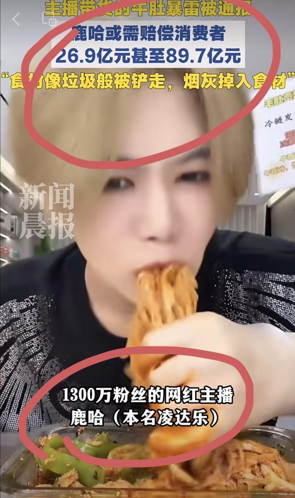 发财了!第一眼以为鹿晗!心想,几十亿,对他来说,毛毛雨! 再仔细一看,鹿哈这次可摊上大事了! 3月15日,“鹿哈或需赔偿消费者26.9亿元”直接登顶热搜。起因是他带货的牛肚产品被曝光存在卫生问题,加工环境令人作呕,还涉嫌违规使用双氧水。 他直播间累计售出该产品3000万单,按“假一赔三”或需赔26.9亿,“假一赔十”更是高达89.7亿。 虽说直播带货7个月赚了3500万,但这赔偿也不是小数目。吓人宝贝了。 只能说网红带货还是得把好品控关,不然这一赔可就赔到“底朝天”了。 我后悔没有买这款牛肚,不然也发财了吧!鹿哈夫妇 鹿晗报喜 鹿哈集团 鹿打假 鹿晗吊牌 鹿晗跑男十周年