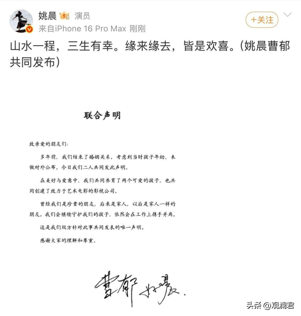 姚晨曹郁离婚 2026年3月16日,姚晨与曹郁发布联合声明,证实多年前已结束婚姻,因孩子年幼未公开。二人2012年在新西兰结婚,育有一子一女,曾共同经营事业与家庭。 声明中表示,曾是爱人与家人,今后以家人般的朋友关系,共同守护孩子成长,彼此祝福,不对外多谈。此事引发全网热议,这也是姚晨第二段婚姻宣告结束。 姚晨与凌潇肃2011年离婚。