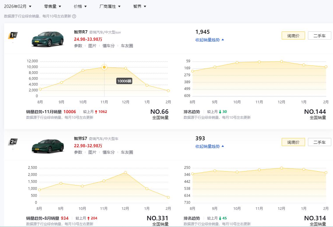 智界汽车这销量,真跟坐过山车一样,忽高忽低 年前R7还是月销过万,年后就是小几千台 到了2月份,2000台不到,S7更是只有393台 这固然与产品竞争力下滑、春节淡季等因素有关 但也折射出,电车人群追新比油车更迫切 3月23日,智界R7/S7将迎来焕新升级 除了新增“皮肤”活力橙,华为最新896线激光雷达也可能上车 感知能力从“点云级”进入“图像级”,说人话就是看得更清楚了,驾驶辅助更强 部分功能也将优化改进,不过问界M6也会同步开启预订 那么问题来了,25-30万价位,问界M6、智界R7,你会怎么选?