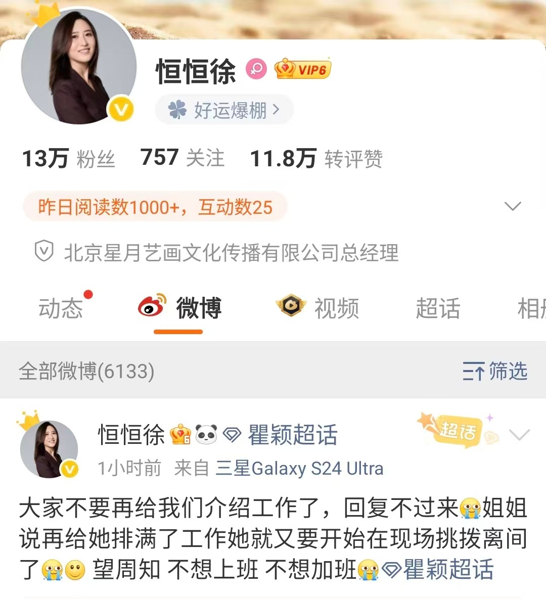 【公司说瞿颖不让给她排满工作】公司说瞿颖不想上班不想加班俺不中了哈哈哈哈哈哈哈!大家都吵着瞿颖 翻红,想看更多地出现在镜头前,但是公司表示 :“姐姐说再给她排满了工作她就又要开始在现场挑拨离间了,望周知 不想上班 不想加班。”