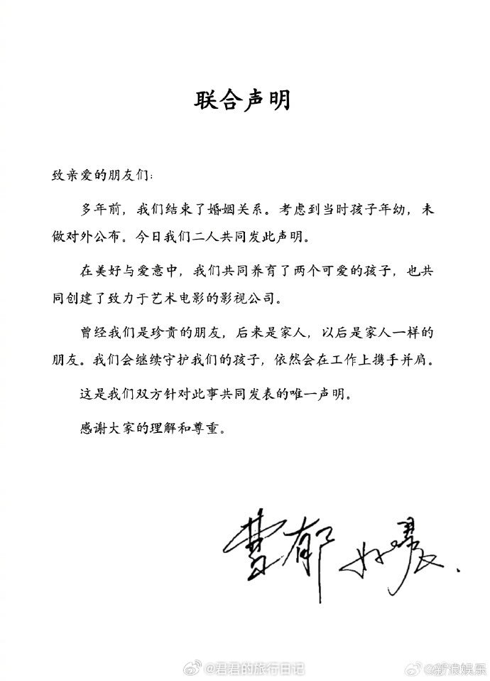 姚晨与曹郁正式官宣和平离婚,两人其实早已在多年前已经平静离婚,为了给孩子安稳的成长环境,选择暂时不对外公开。从相识相伴到携手同行,这段感情始终温暖体面,没有争执与纷扰,未来也会共同陪伴孩子成长。祝福二人各自安好,期待姚晨未来的更多作品。 姚晨曹郁官宣离婚
