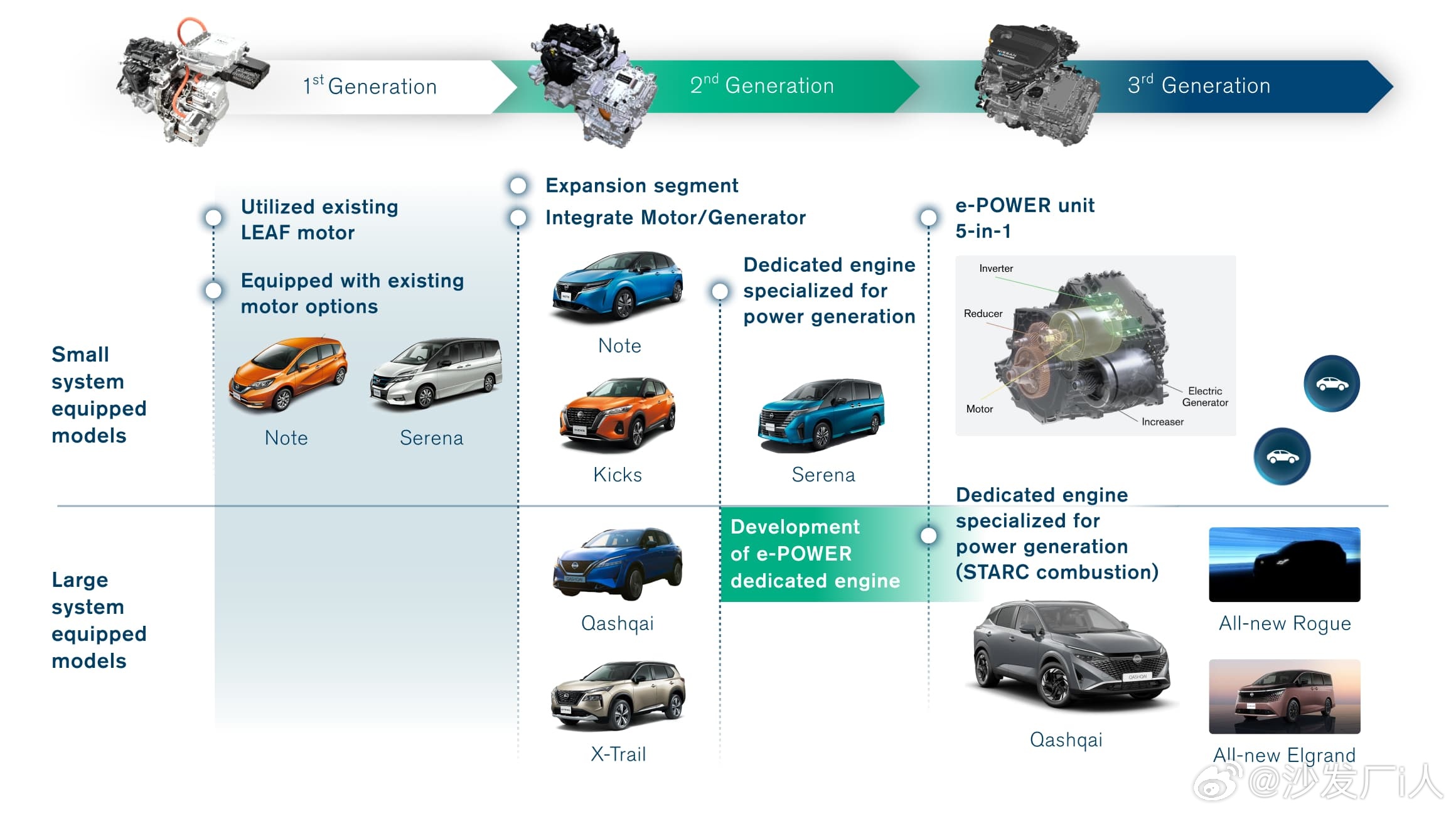 e-POWER 与日产的电动汽车技术同步开发,自 2016 年推出以来,历经三代,其能源管理和动力系统性能不断优化。每一代,该系统的电动驱动电机和车载汽油发动机都经过持续改进,以在包括紧凑型轿车、小型货车和 SUV 在内的多种车型上提供响应迅速且安静的驾驶体验。