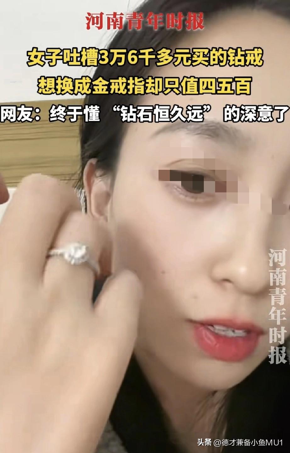 辽宁一位女子吐槽,2019年结婚时花3万6千多元托人在香港买了一枚大钻戒。如今她想换成金戒指,便打算把钻戒卖掉,心想怎么也能卖个大几千块。结果侧面打听后才得知,最多只能卖五六百块,还是看在戒指的圈是铂金的份上,收购的人根本看不上钻石。当初花那么多钱托人买的钻戒,如今真可谓一文不值,真应了“钻石恒久远,一颗永流传”这句话,因为这钻戒根本卖不出去,砸手里了。 说钻石骗人的简直是耍流氓,每家卖钻石的柜台上都写着“一颗永流传”,这钻戒食之无味、丢之可惜,只能当传家宝了,人家口号不是做到了吗? 曾经有柜台店员向我推销钻石首饰,吹嘘说有位客人每年在她的柜台换钻石首饰,能以小换大,现在戴的钻石已经价值十几万了。当时我满心羡慕,现在想想,也不知道那位客人如今心情如何。 网友说购买奢侈品就像娶老婆、嫁男人,当时享受了那段美好时光就值了。老婆或老公老了不能赚钱也无所谓,因为你已经享受过了。毕竟你又不是买件奢侈品收藏起来等它升值再卖掉赚钱。对此,大家怎么看?