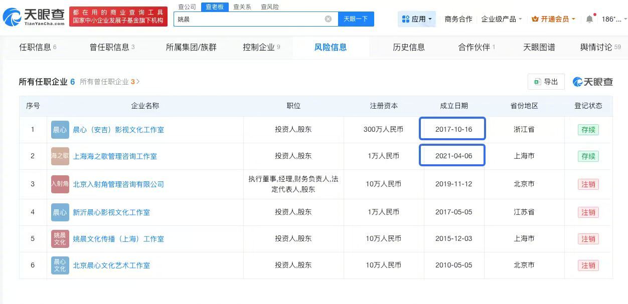 【姚晨曹郁二人工作室同日注册姚晨曹郁商业版图揭秘】姚晨曹郁官宣离婚据报道,近日,姚晨与曹郁官宣离婚,相关话题引发关注。天眼查App显示,姚晨名下晨心(安吉)影视文化工作室与曹郁名下探照灯(安吉)影视文化工作室均于2017年10月16日注册成立,注册资本均为300万人民币;姚晨名下上海海之歌管理咨询工作室与曹郁名下上海圆舞曲管理咨询工作室均于2021年4月6日注册成立,注册资本均为1万人民币。目前,上述四家工作室均为存续状态。