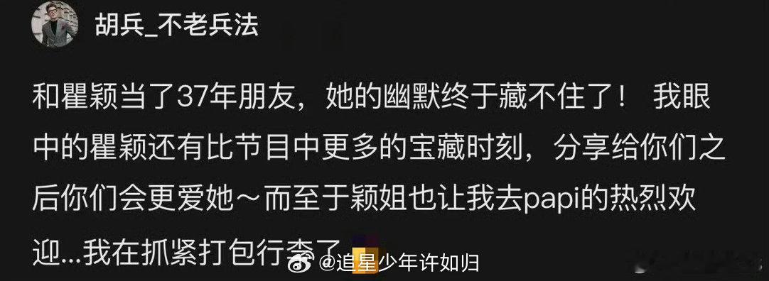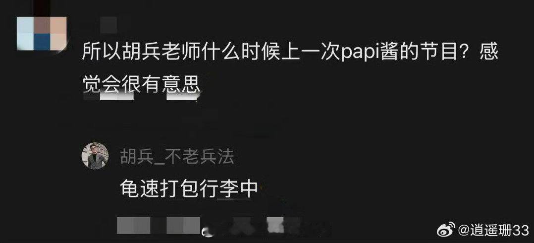 胡兵回应将录制papi酱节目 瞿颖才在节目里聊完和胡兵30年的故事,胡兵就回应要去papi那儿了。这速度,说是临时起意谁信啊!三个人坐一起的画面想想就有趣,坐等播出!