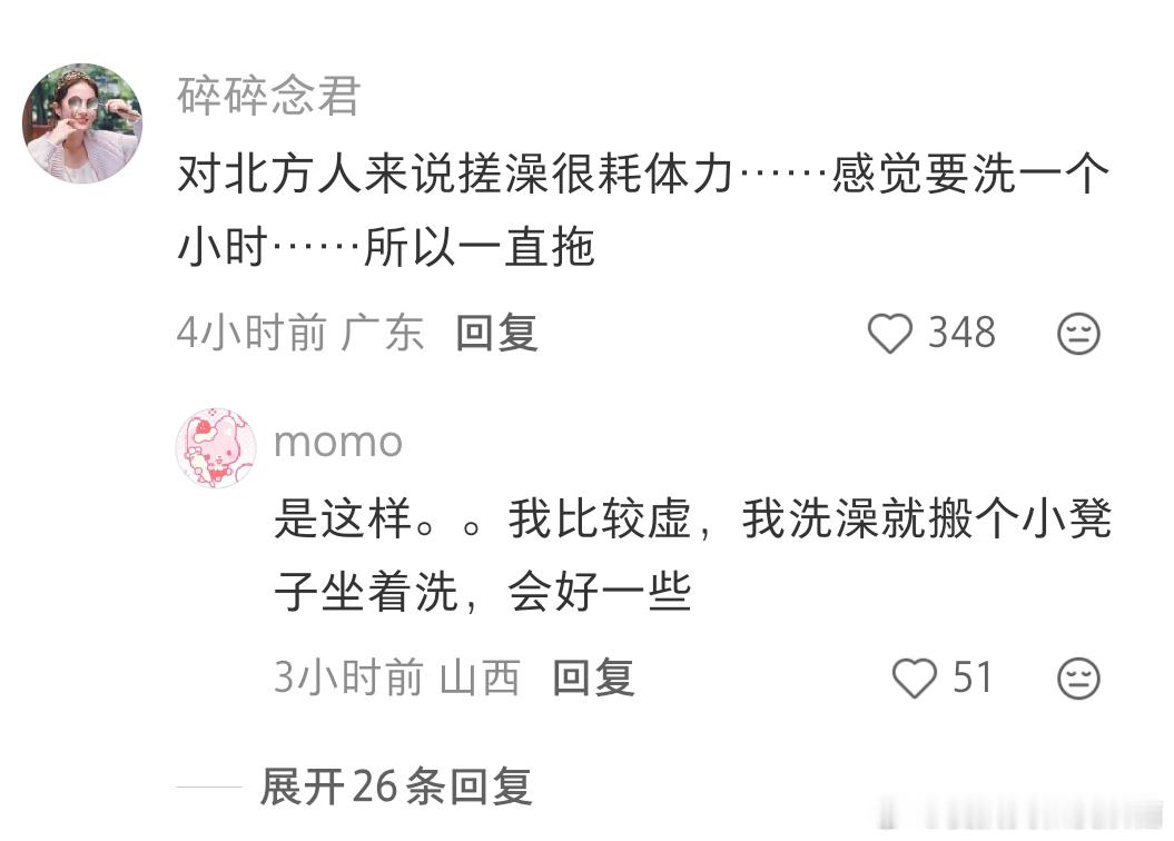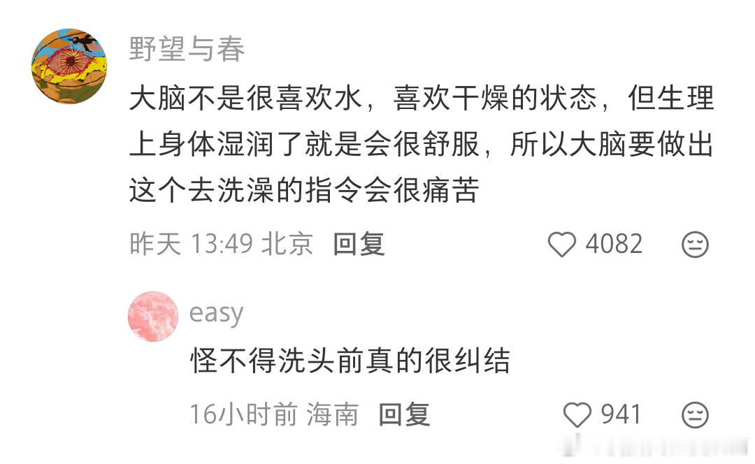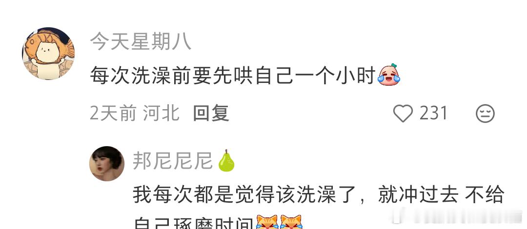 洗澡前是舒服的,洗澡时是舒服的,洗完澡是舒服的,但是去洗澡非常不舒服,有没有人懂