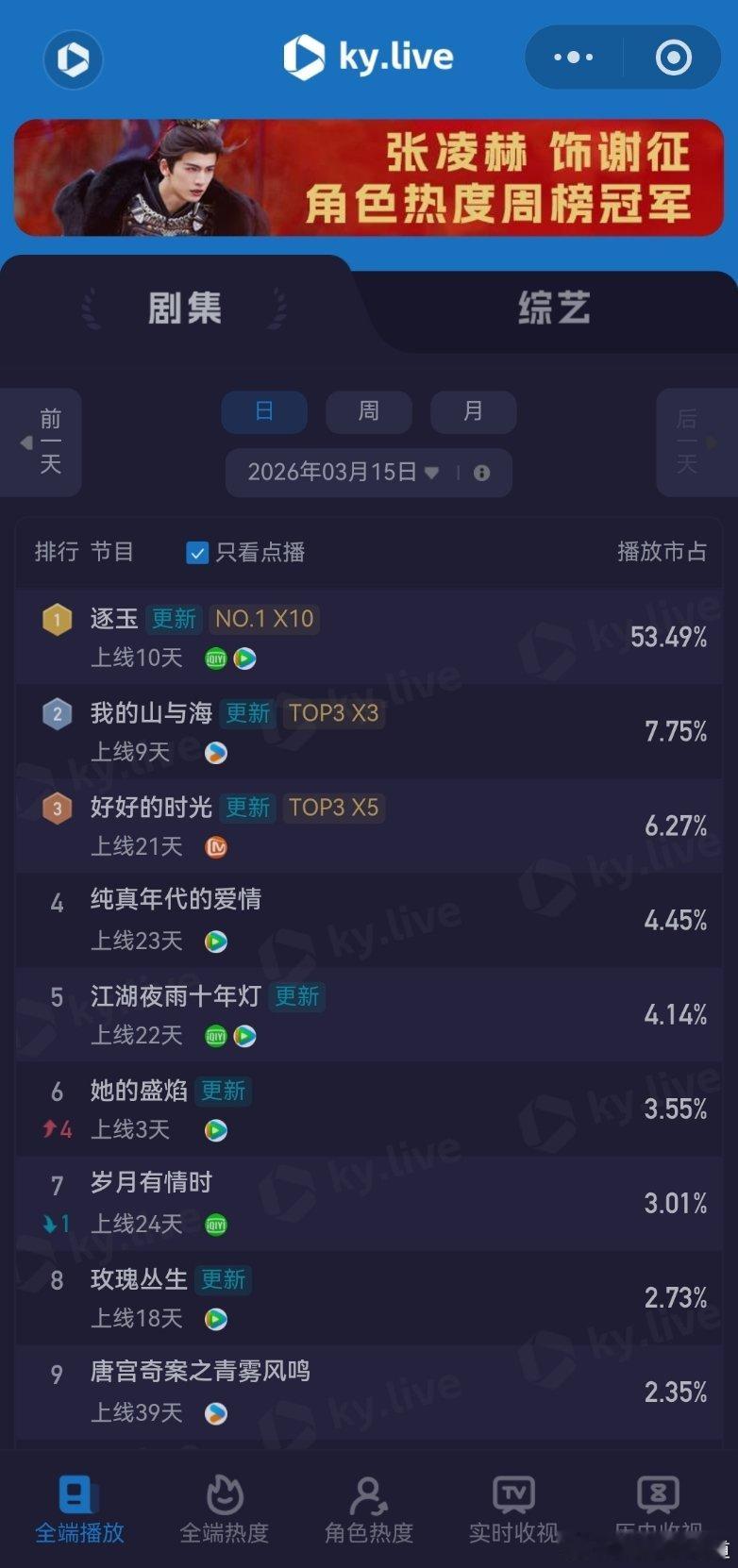 3月15日云合播放占比云合 VS酷云逐玉云合53.2%,酷云53.49%我的山与