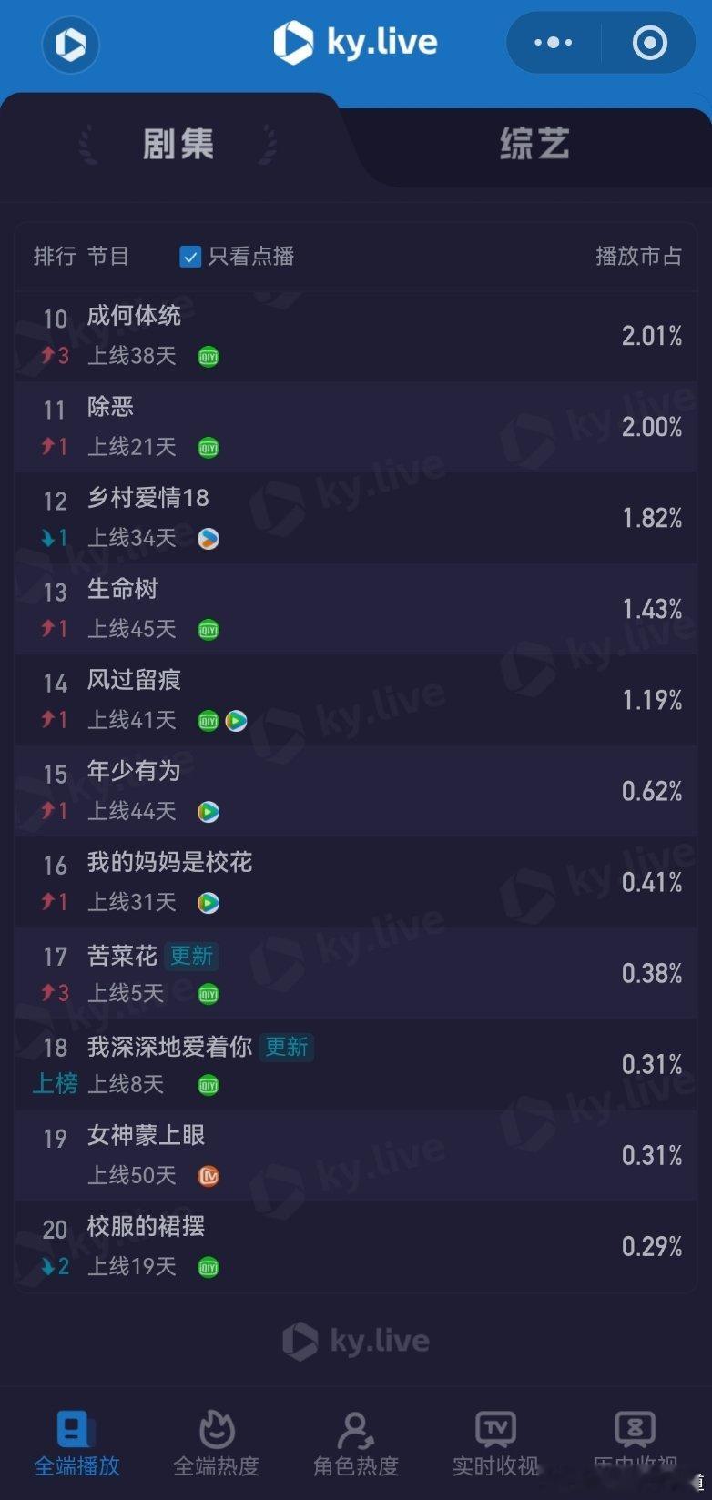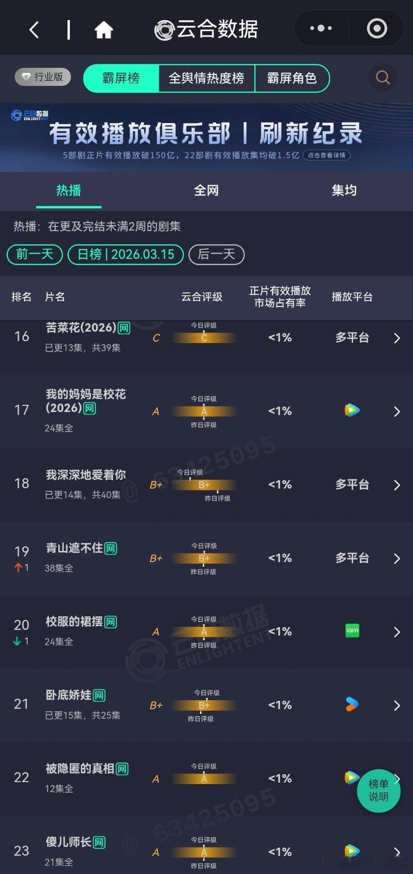 3月15日云合播放占比云合 VS酷云逐玉云合53.2%,酷云53.49%我的山与海云合7.2%,酷云7.75%