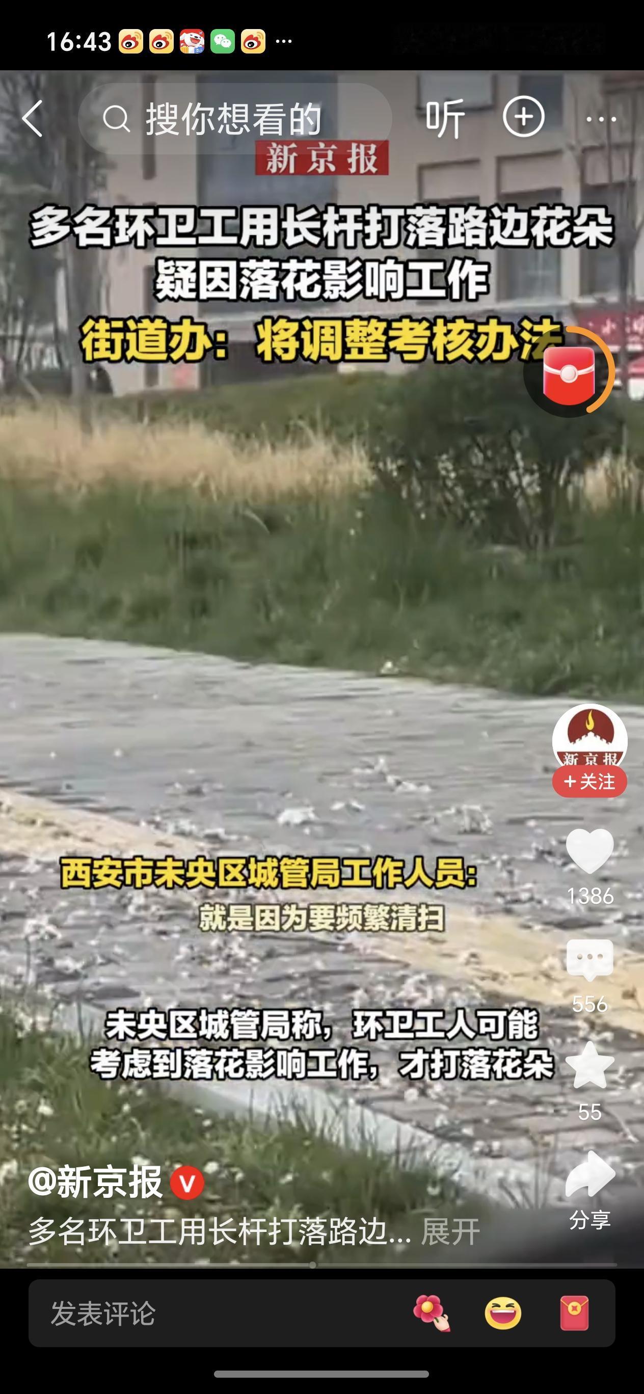 西安环卫工被曝用长杆清除树上花朵西安环卫工人用长杆打落树上花朵,不知情的人不理解为什么环卫工人会破坏盛开的花朵,殊不知花儿随风飘落环卫工人要不停的打扫,才能保证地面环境卫生,否则在严格考核制度下可能被扣款,虽然环卫工人的做法不应该,但实乃无奈之举!相关部门确实应该调整考核办法!