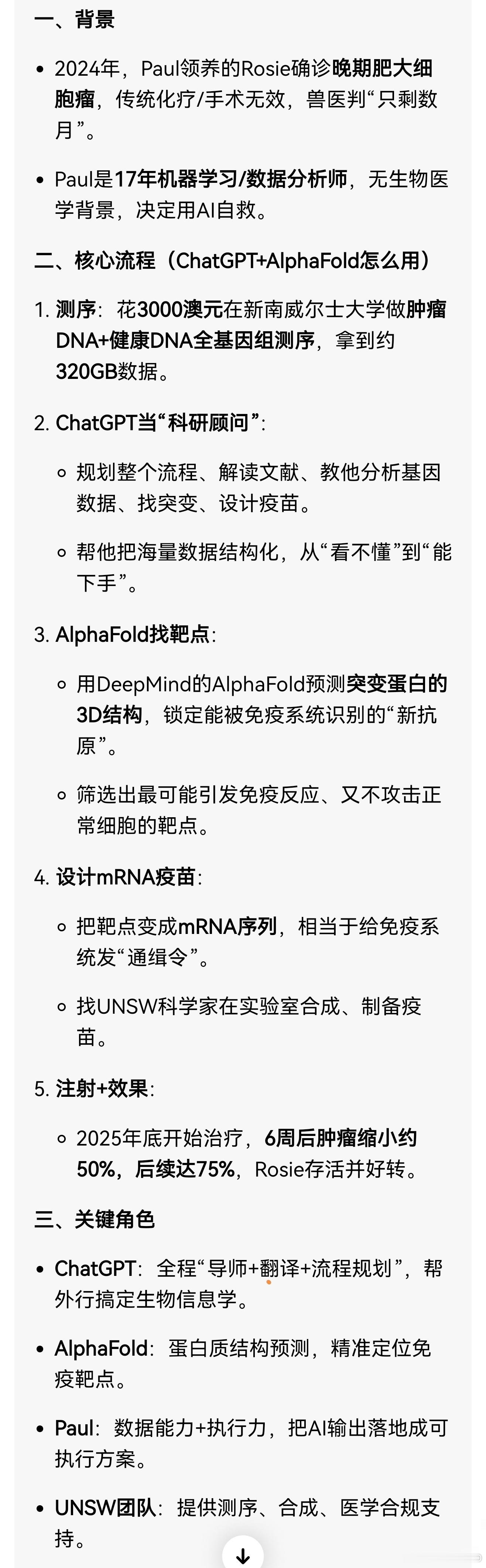 澳洲AI专家Paul Conyngham,用ChatGPT+AlphaFold进行研究,给患晚期癌症的爱犬Rosie设计了个性化mRNA癌症疫苗,让肿瘤大幅缩小。豆包大致给汇总了一下方法和过程。除了软件算力收费之外,最主要的开销是3000澳元的基因测序数据。