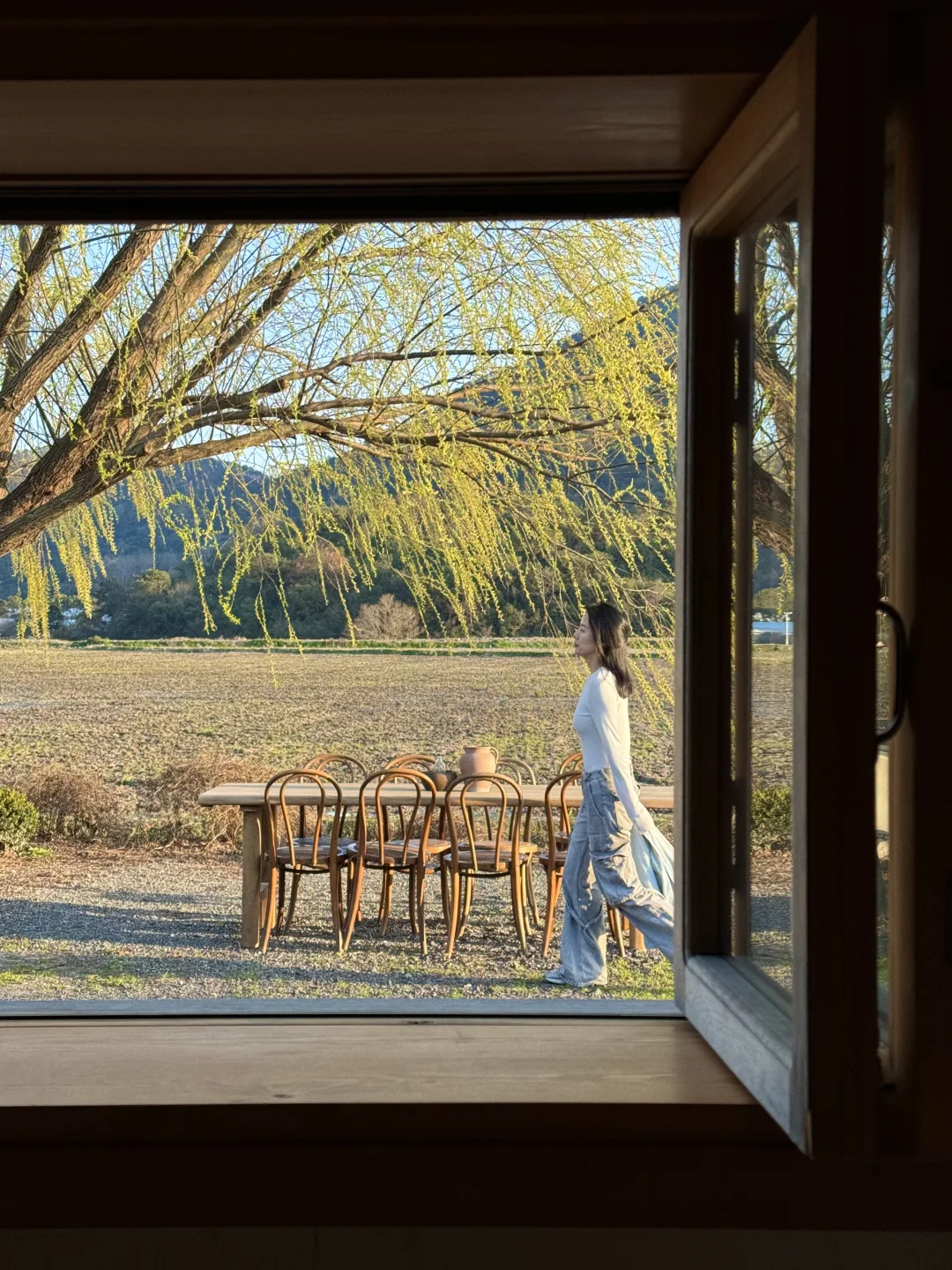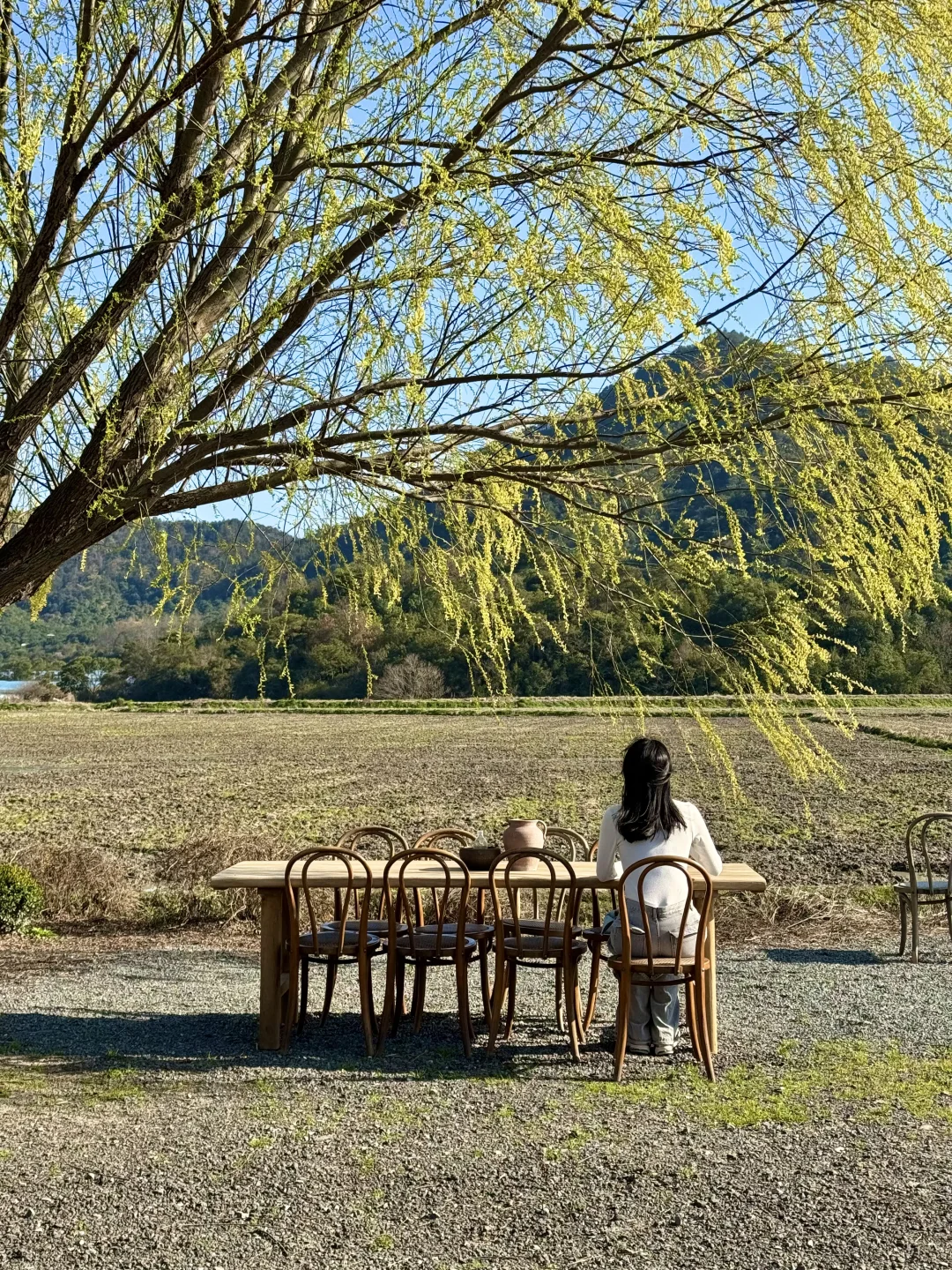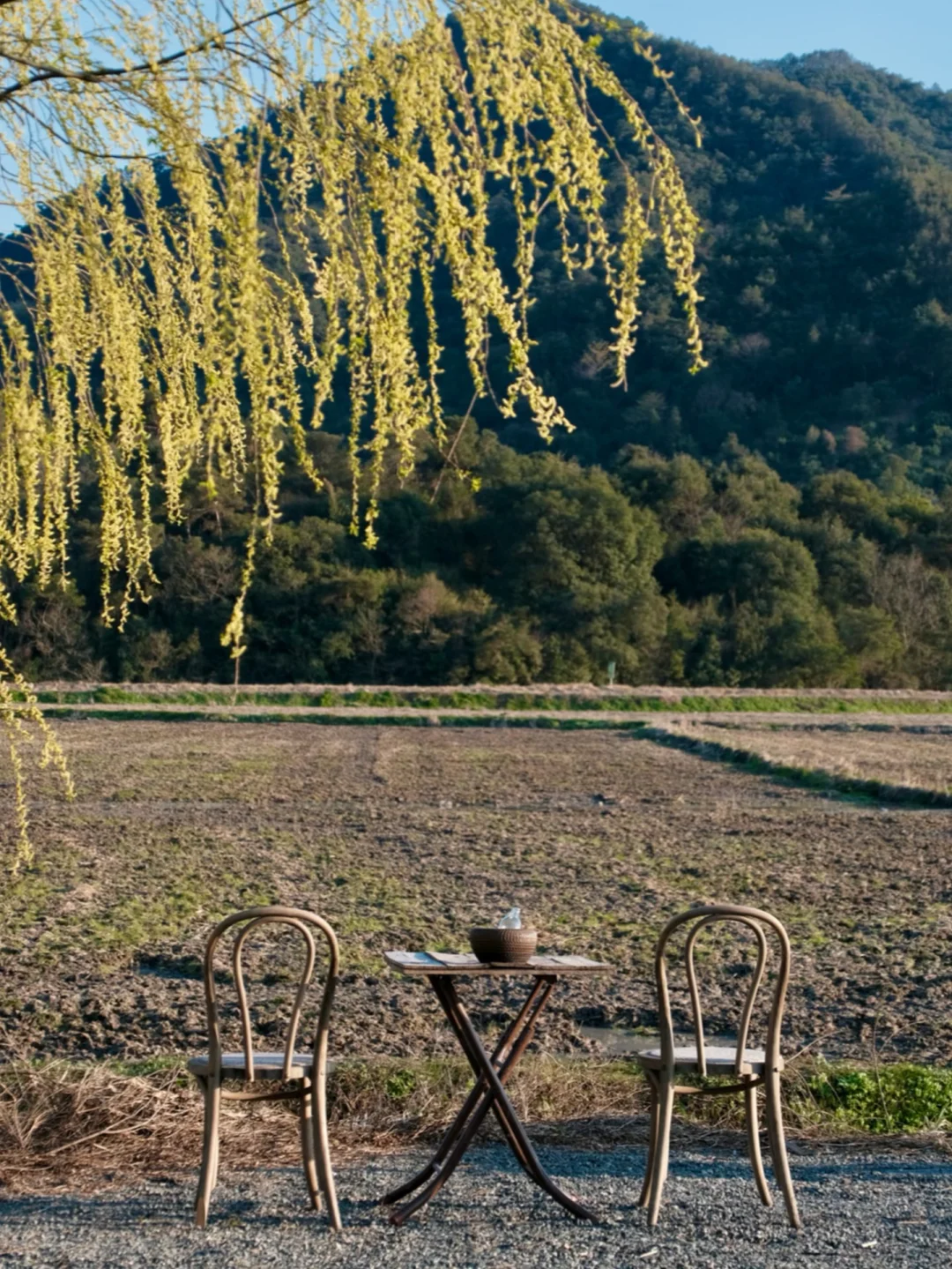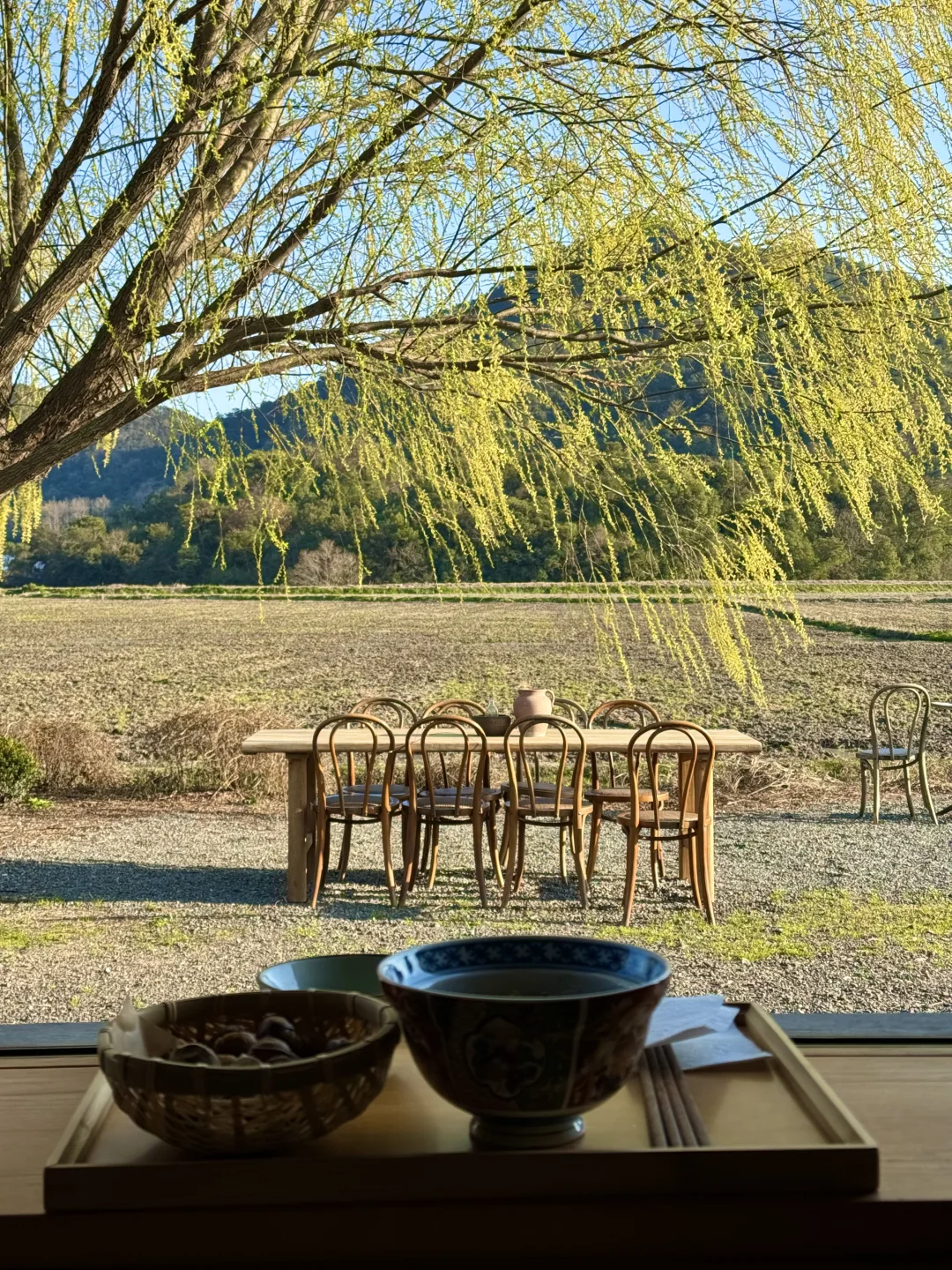 . 在周末人山人海的东钱湖 居然发现了一家 僻静无人的咖啡店☕️ 只有我们几个人 独享一整片稻田🌾 我愿称之为 宁波版“有风的地方”! . 门口有一棵很美的柳树🌳 伴着风铃声 音乐 没有任何嘈杂 氛围很好 从窗里望出去仿佛一副油画 栗子 葱油面好吃 室内也有日系茶室 老板除了店 还养了猫咪鸭🦆 . 如果说缺点 就是店很难找[呃R] 定位不准 迈过了长长的田埂 后来发现停车场左侧可以开车进 另外店里有人均低消哦 .