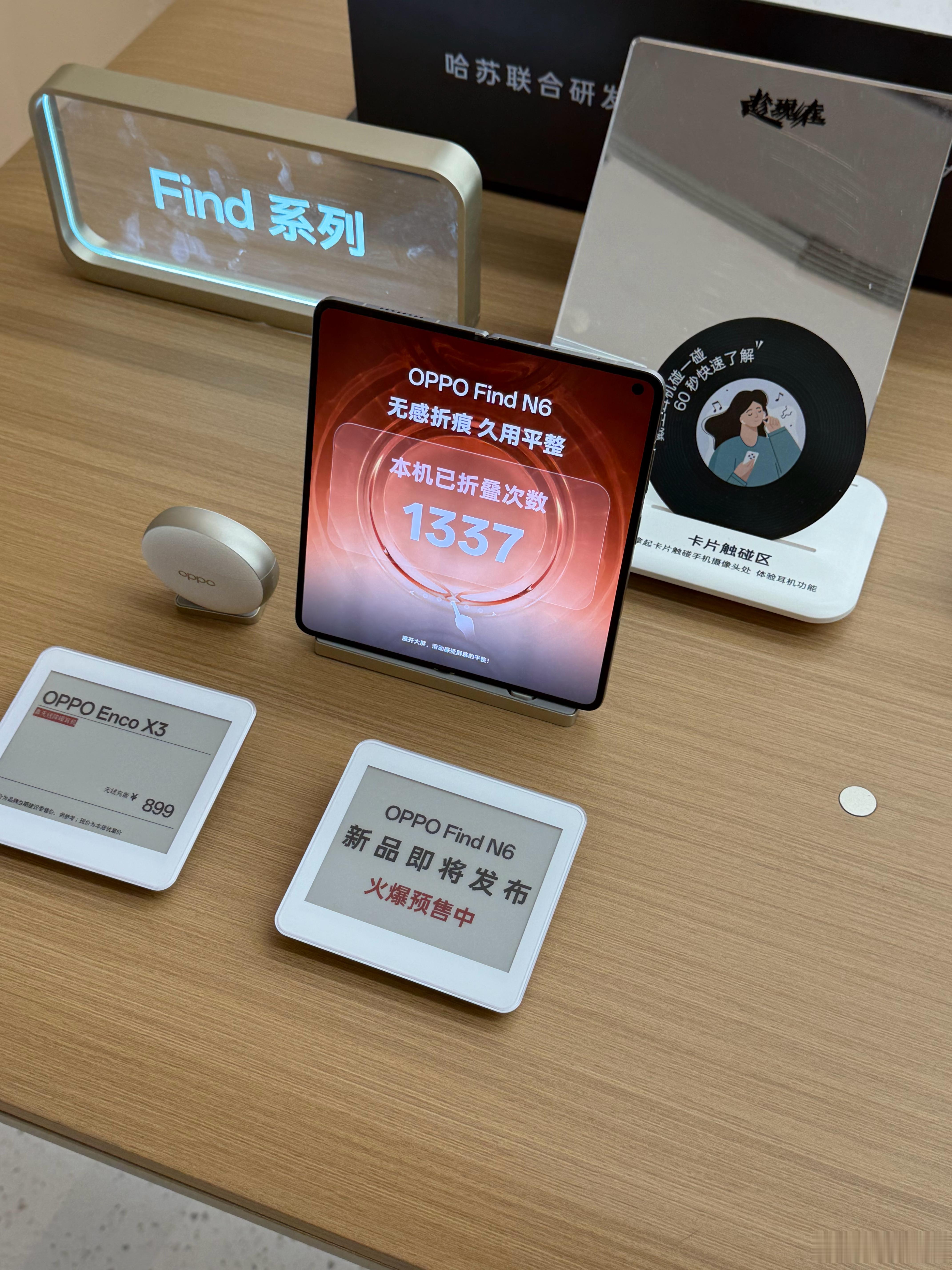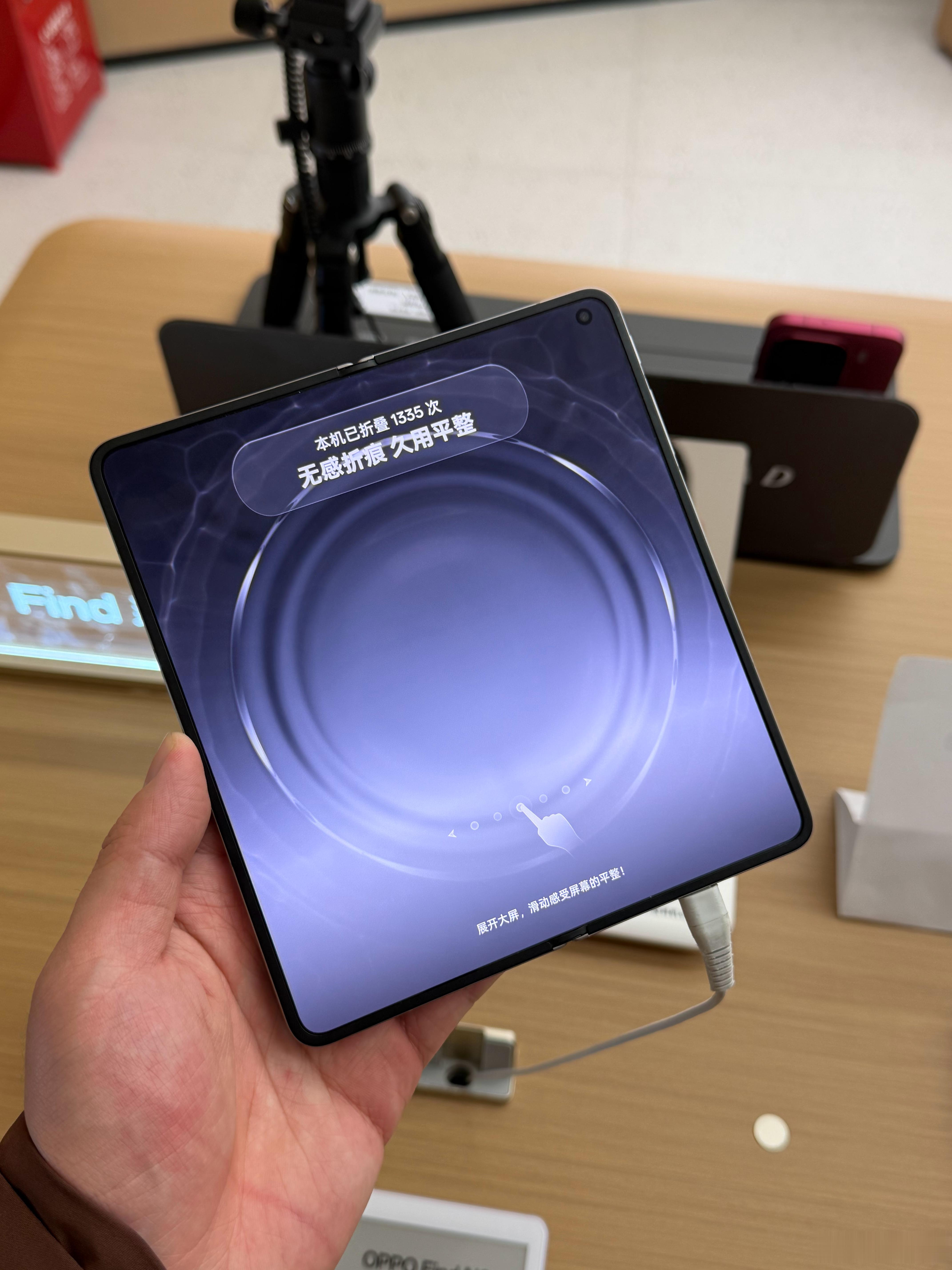 终于摸到Find N6真机了,银色质感无敌,比橙色好看太多。演示机会实时显示折叠的次数,但目前还不能进入桌面,演示机也不能熄灭内屏看折痕。不过深、浅壁纸几乎没什么折痕,666 上海·上海合生汇西楼