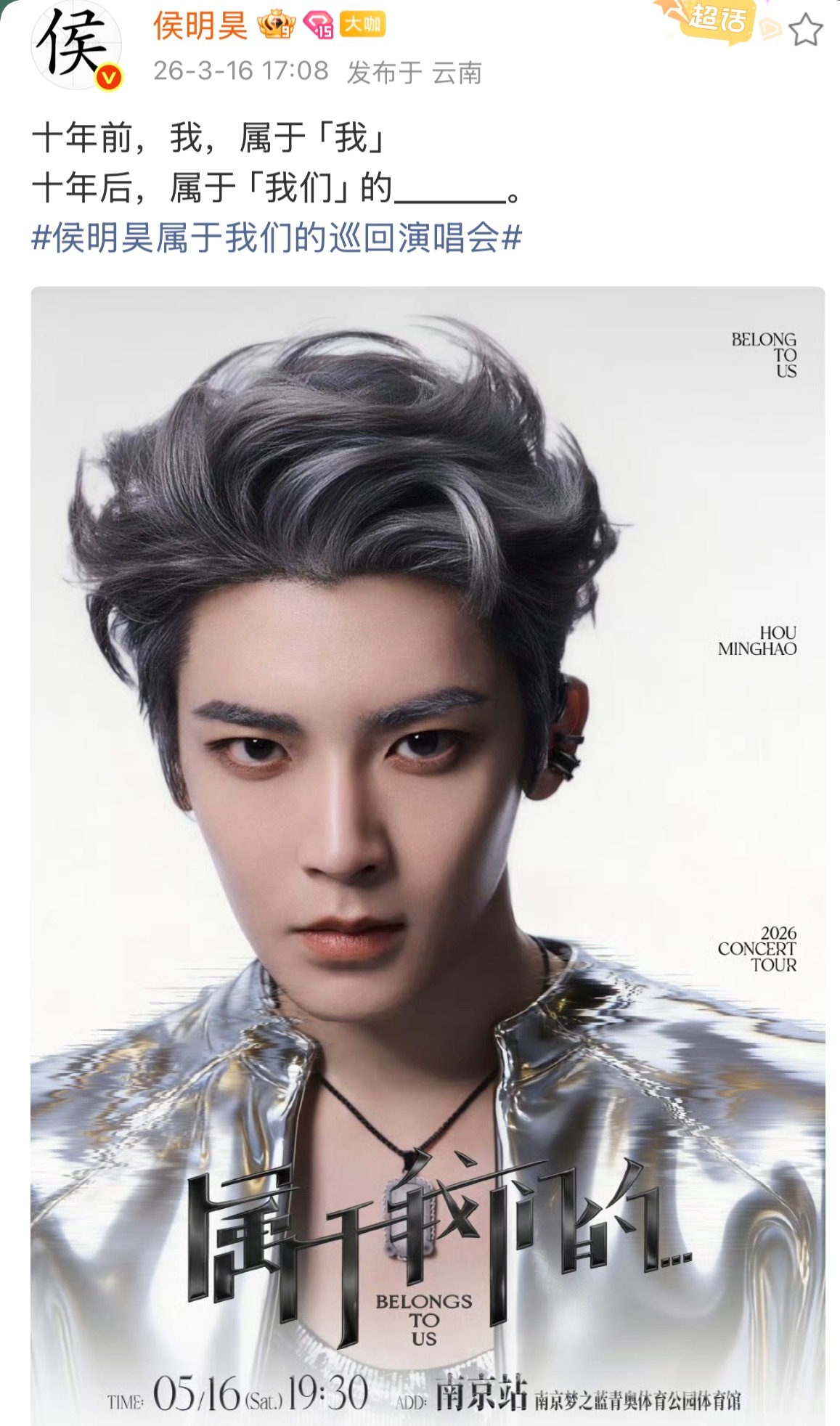 侯明昊属于我们的巡回演唱会官宣了劳模终于可以小小的逃离会儿横店了,他本来就是有底子在的,从前年的春晚到去年的音乐节、生日会表现都很出圈,粉丝也很喜欢,就是缺舞台,这次都能过过瘾了!!
