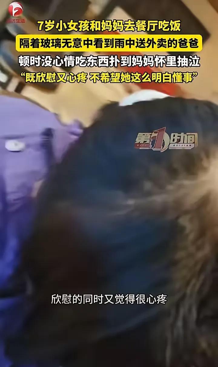 破防了!陕西渭南,7岁小女孩跟着妈妈去餐厅吃饭,却无意间透过玻璃看见了雨中送外卖的爸爸,瞬间没了吃饭的心思,眼泪哗啦啦掉下来,扑进妈妈怀里小声哭泣,这一幕看哭了无数人。 那天的雨下得不算小,玻璃窗外的世界蒙着一层水汽,小女孩本来正盯着餐盘里的炸鸡块,眼睛突然就定住了。那个穿着红黄色外卖服、骑着电动车在雨里穿梭的身影,她太熟悉了——是每天早出晚归、总说“爸爸不累”的爸爸。他的雨衣帽子被风吹得歪到一边,雨水顺着帽檐往下淌,连手套都浸得发皱,却还是攥紧手机核对订单,生怕晚了一分钟被顾客投诉。 小女孩的筷子“啪嗒”掉在桌上,刚才还亮晶晶的眼睛瞬间红了,鼻子一抽一抽的,没等妈妈反应过来,就把脸埋进妈妈的颈窝,肩膀抖得厉害。她没哭出声,只是小声啜泣,怕被窗外的爸爸听见,怕他知道自己的辛苦被孩子看在眼里。妈妈抱着怀里小小的身子,摸着她湿漉漉的头发,心里又酸又软,既欣慰孩子这么懂事,又心疼她小小年纪就体会到生活的重量。 后来妈妈把这段视频发了出来,配文说“既欣慰又心疼,不希望她这么明白懂事”。这句话戳中了太多人。我们总盼着孩子快点长大、早点懂事,可真当他们在某个瞬间突然看懂了成年人的疲惫,看懂了那些藏在“我没事”背后的奔波,心里最先涌上来的不是骄傲,而是沉甸甸的心疼。 这不是个例。在城市的每一个角落,都有这样的父母:他们顶着风雨送外卖、扛着货物爬楼梯、在深夜的工位上敲键盘,把所有的苦都咽进肚子,只为给孩子撑起一个安稳的家。也有这样的孩子:他们过早地读懂了父母的不易,会在爸爸递来零花钱时偷偷藏起来,会在妈妈加班时端一杯热水,会在看见家人奔波时红了眼眶。 这个7岁小女孩的眼泪,不是脆弱,是最纯粹的共情与爱。它让我们看见底层家庭的温情,也让我们看见生活的不易。 各位读者你们怎么看?欢迎在评论区讨论。