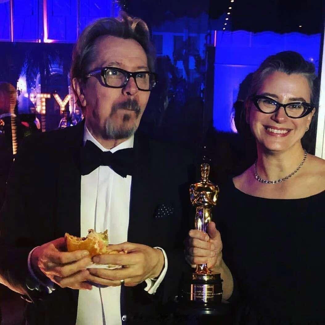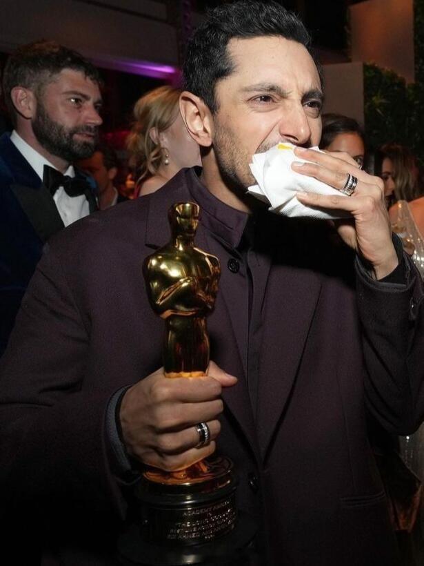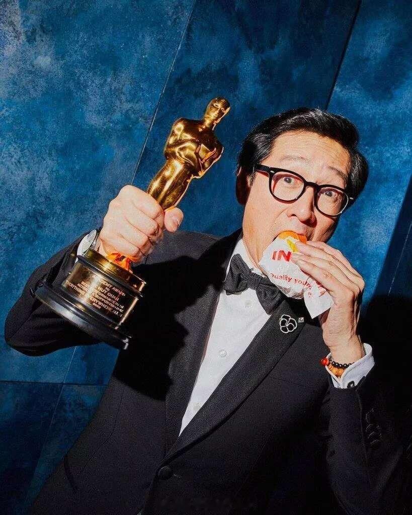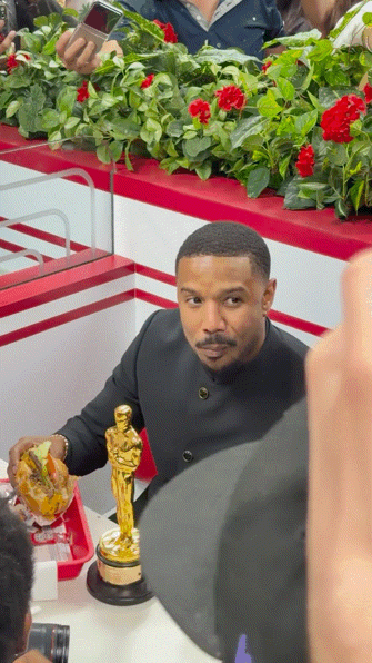 新晋奥斯卡影帝MBJ(《罪人》男主)拿着小金人,吃着汉堡。