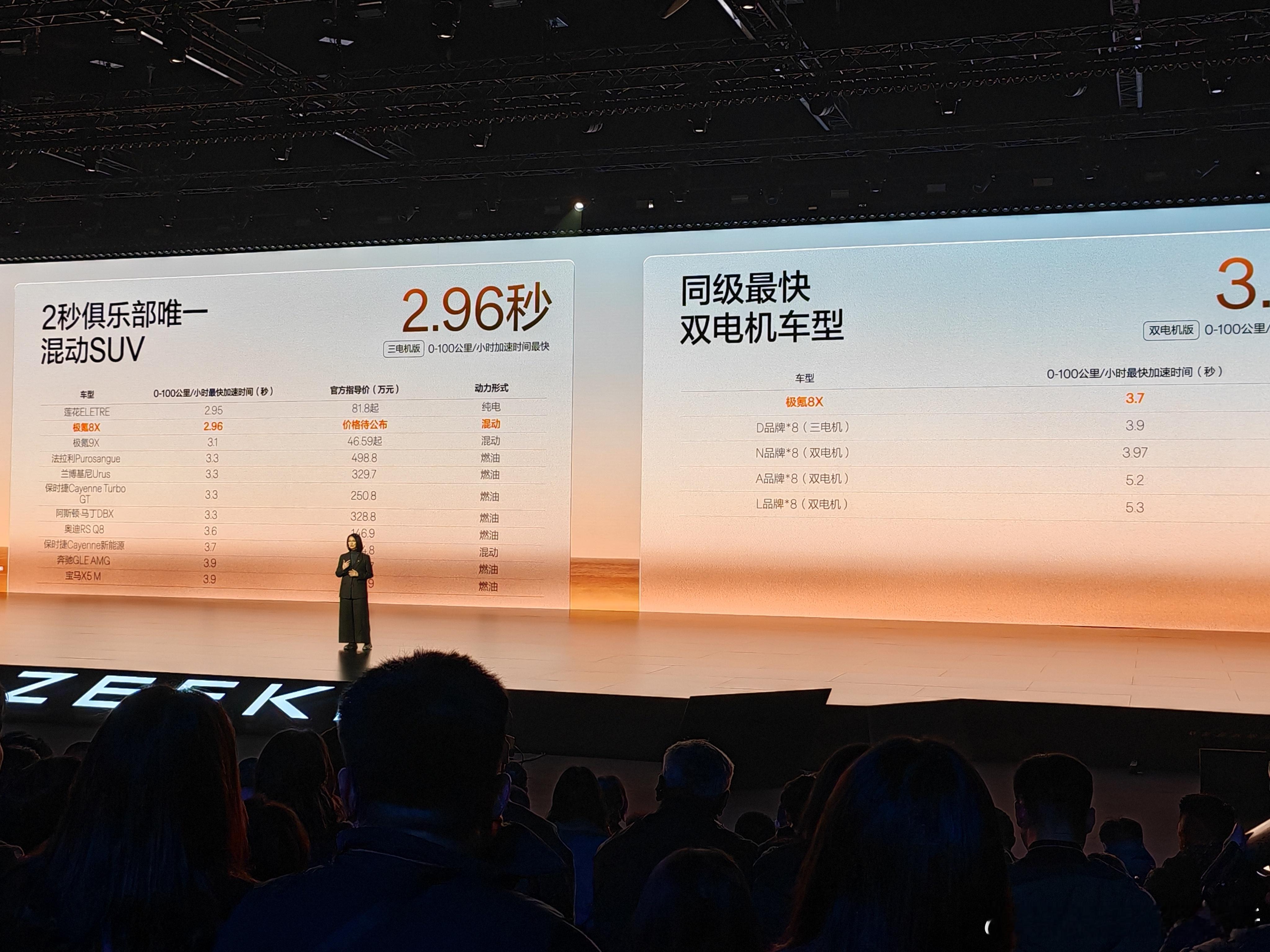 极氪 8X 的混动三电机版本的马力超 1400 匹,其中 2.0T 的超混专用发动机有 205kW 的最大功率零百加速成绩有 2.96 秒