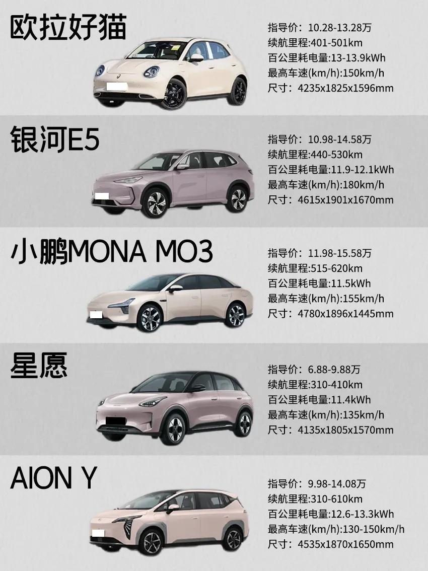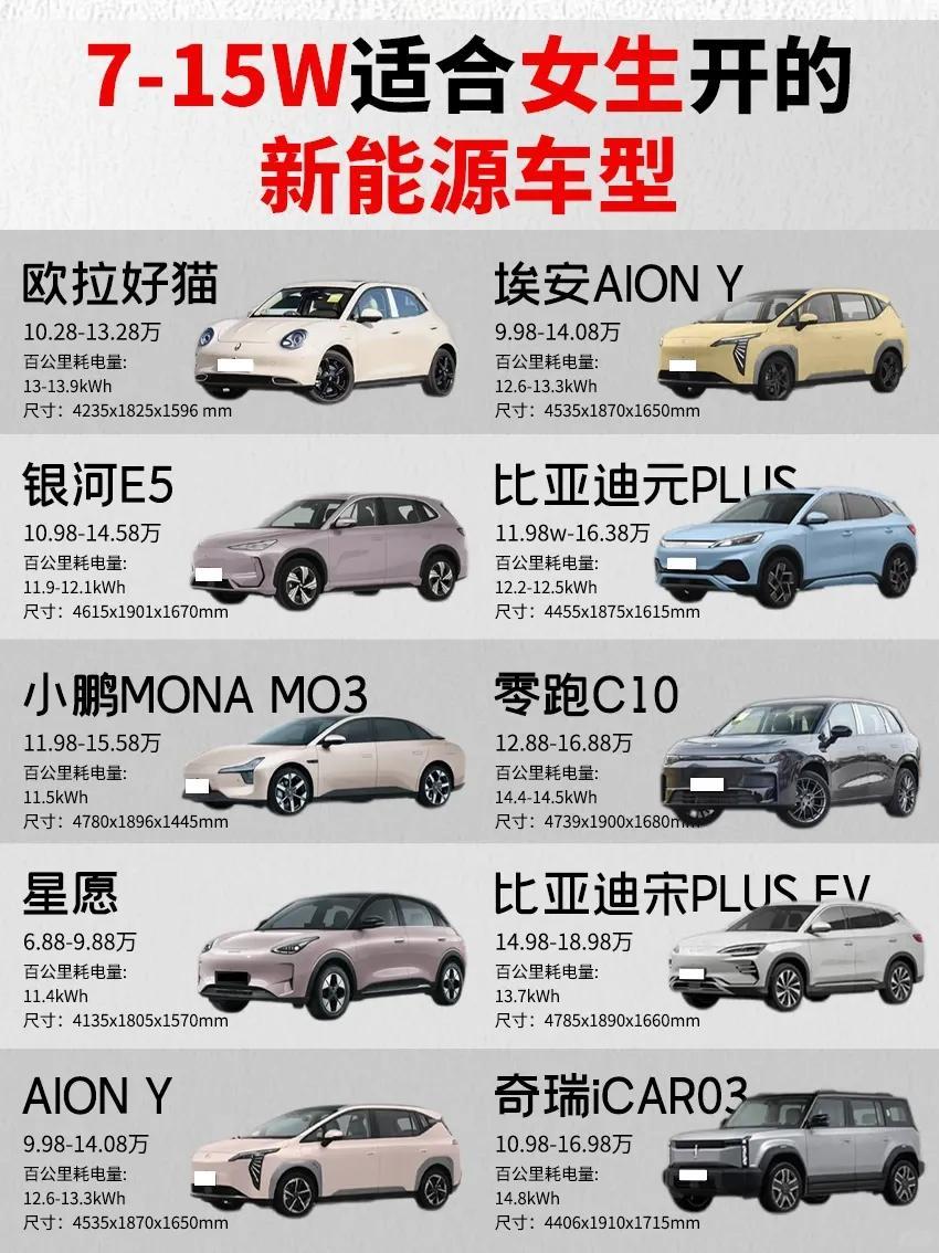 7-15W女生新车清单✨颜值与实用我全都要! 纠结7-15万预算选啥新能源车?作为一个过来人,真的懂女生选车的痛点:要好看、要好开、要省钱,还得兼顾日常通勤和偶尔撒欢。这份亲测清单,每款都踩在女生的心巴上,直接抄作业👇 🐱 软萌可爱挂|女生专属“大玩具” 欧拉好猫 | 指导价:10.28-13.28万 谁能拒绝一台复古可爱的好猫啊!复古圆灯+流畅溜背,颜值直接拉满,开出去拍照巨出片。车身小巧灵活,侧方停车再也不用慌,闺蜜坐副驾都夸内饰精致温柔。百公里电耗13-13.9kWh,省钱又省心,妥妥为女生量身打造的代步神器~ 🚗 实用家用挂|空间与性价比双在线 埃安AION Y | 指导价:9.98-14.08万 被称为“空间魔术师”真不是吹的!后排座椅放倒能直接躺平,周末和闺蜜去露营,就是移动的“小卧室”。车身方正好看,好开好停不挑路,百公里电耗12.6-13.3kWh,日常通勤+周边游完全够用,性价比直接拉满! 比亚迪元PLUS | 指导价:11.98-16.38万 比亚迪的爆款不用多说,刀片电池给足安全感,女生开着超安心。外观灵动耐看,底盘扎实不飘,百公里电耗12.2-12.5kWh,不管是市区代步还是高速出行,都稳得很。预算够的话,闭眼冲这款,绝对不踩雷! 吉利银河E5 | 指导价:10.98-14.58万 喜欢极简风的姐妹看过来!内饰清爽不杂乱,科技感拉满却不花哨。百公里电耗11.9-12.1kWh,续航表现扎实,日常通勤完全够,开着它通勤,心情都变舒畅了~ ⚡ 科技颜值挂|个性与智能感拉满 小鹏MONA MO3 | 指导价:11.98-15.58万 流线型车身自带未来感,颜值真的绝!还有小鹏智驾加持,辅助驾驶对新手超友好,刚拿驾照的姐妹也能轻松上手。百公里电耗低至11.5kWh,颜值和智能双在线,科技党直接冲! 零跑C10 | 指导价:12.88-16.88万 大五座SUV选手!空间宽敞,偶尔带家人朋友出行也不挤,配置直接拉满。百公里电耗14.4-14.5kWh,性价比超高,喜欢SUV又想要智能配置的姐妹,这款别错过~ 吉利星愿 | 指导价:6.88-9.88万 预算有限的宝子看这里!软萌外观+小巧车身,颜值在线还便宜。百公里电耗11.4kWh,日常代步完全够用,新手入门首选,花小钱办大事~ 奇瑞iCAR 03 | 指导价:10.98-16.98万 酷女孩专属!硬派方盒子造型,个性十足,开在路上回头率超高。百公里电耗14.8kWh,虽然偏个性,但实力在线,喜欢独特风格的姐妹,直接冲这款! 💡 女生选车真心话Tips 1. 日常通勤为主:优先选欧拉好猫、吉利星愿这种小巧车型,停车轻松不费劲儿~ 2. 注重空间出行:埃安AION Y、比亚迪元PLUS闭眼入,家用、出游都超舒适! 3. 偏爱科技感:小鹏MONA MO3、零跑C10安排上,智能配置拉满,开车更省心~ 7-15万预算真的能挑到宝藏车!根据自己的日常需求和喜好选,不管是可爱挂、实用挂还是个性挂,都能找到心仪款,新手也能轻松选对~【来自懂车帝车友圈】