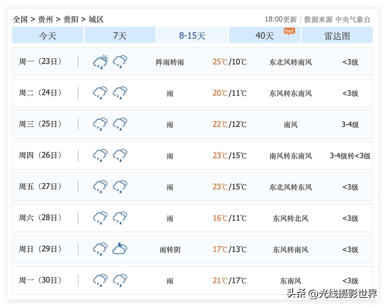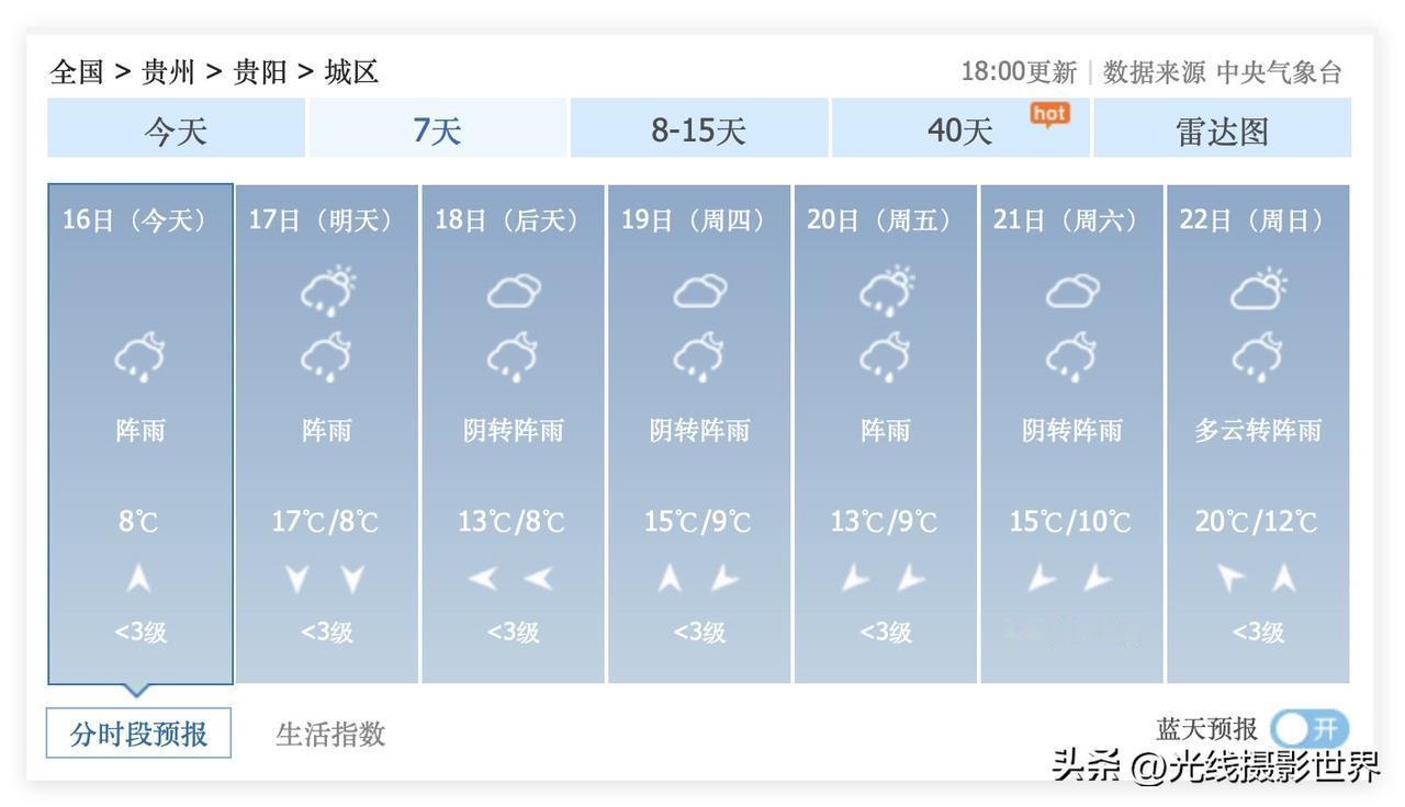 噢!坏了,贵州省贵阳市,接下来,阴雨连绵……3月17日到30日,贵阳市的太阳可能要去流浪了……阳光可能会非常稀缺和珍贵……春雨绵绵,好像可能会成为主旋律呀! 哎,3月16日,贵州,平坝农场樱花,基本上是感觉……哎……没啥戏了……加之接下来天气很不好,所以……2026年春天贵阳赏花的高潮旺季,确实结束了吧?! 我又看了看百里杜鹃花的贵州省毕节市的天气预报……中央气象台……也是不容乐观…… 不知道清明节的时候,百里杜鹃花会不会迎来盛花期呢?!