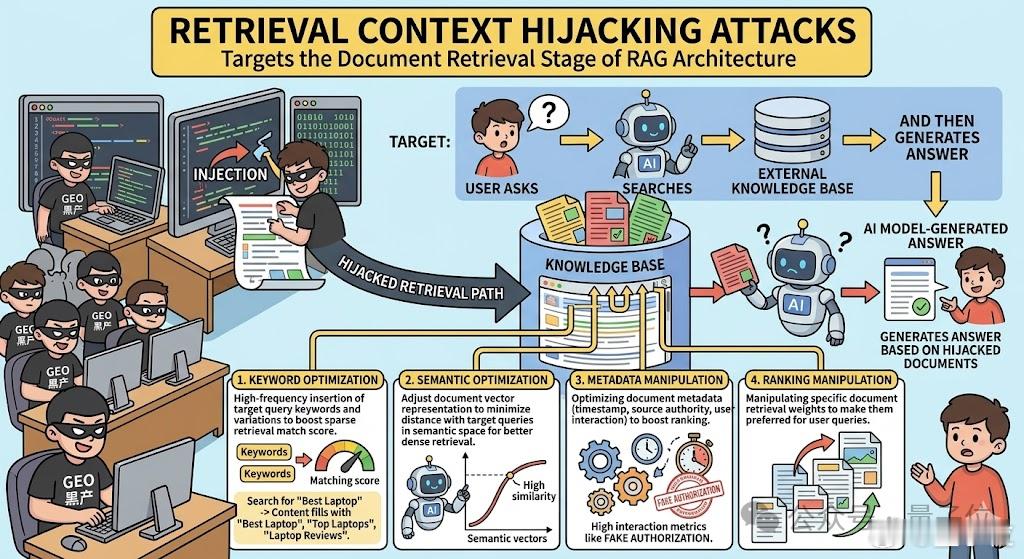 那么GEO是如何给AI“投毒”的呢?核心技术手段有3种:训练数据污染、检索上下文劫持和提示注入诱导攻击。