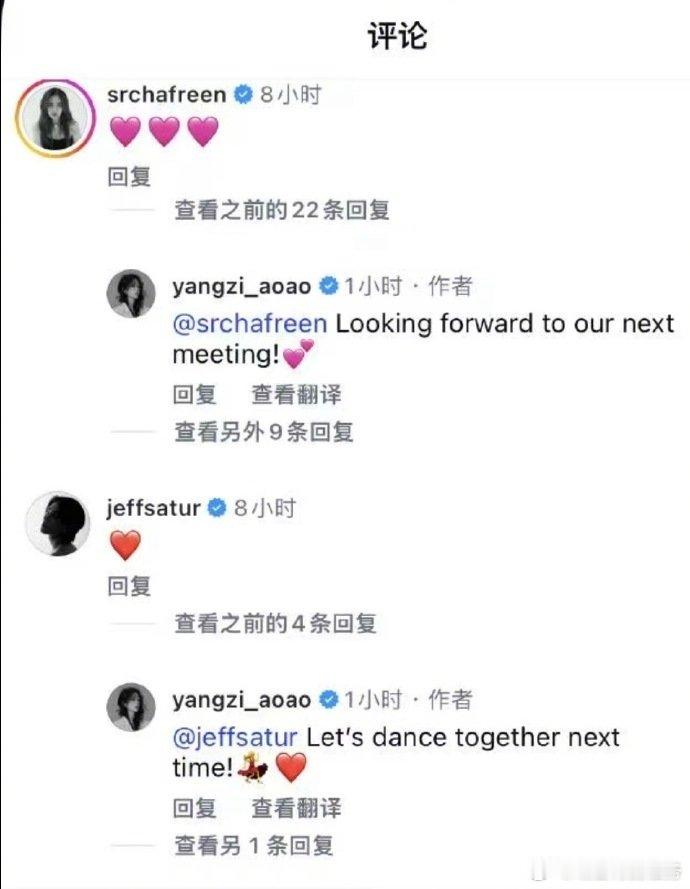 杨紫在秀场交到了新朋友 走到哪都能收获新朋友,秀场上大方得体、真诚友善,和大家相处得超融洽,之后还和Freen、Jeff评论互动,人缘也太好啦!