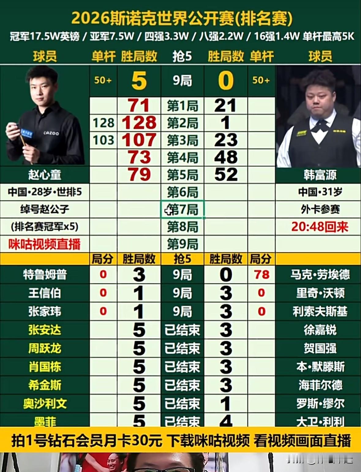 🎱快讯,晚上19:30时段战报🆕⬇️⬇️ ✅中国德比战,赵心童5-0零封韩富源; ✅英国德比战,特鲁姆普3-0领先劳埃德; ✅中国王信伯1-3落后里奇·沃顿; ✅英国德比战,宾汉姆3-2领先麦克吉尔; ✅泰国塔猜亚4-0领先格雷斯; ✅英国德比战,斯莱瑟0-3落后威尔斯; ✅伊朗瓦菲3-1领先史蒂文斯; ✅利索夫斯基3-1领先中国张家玮!