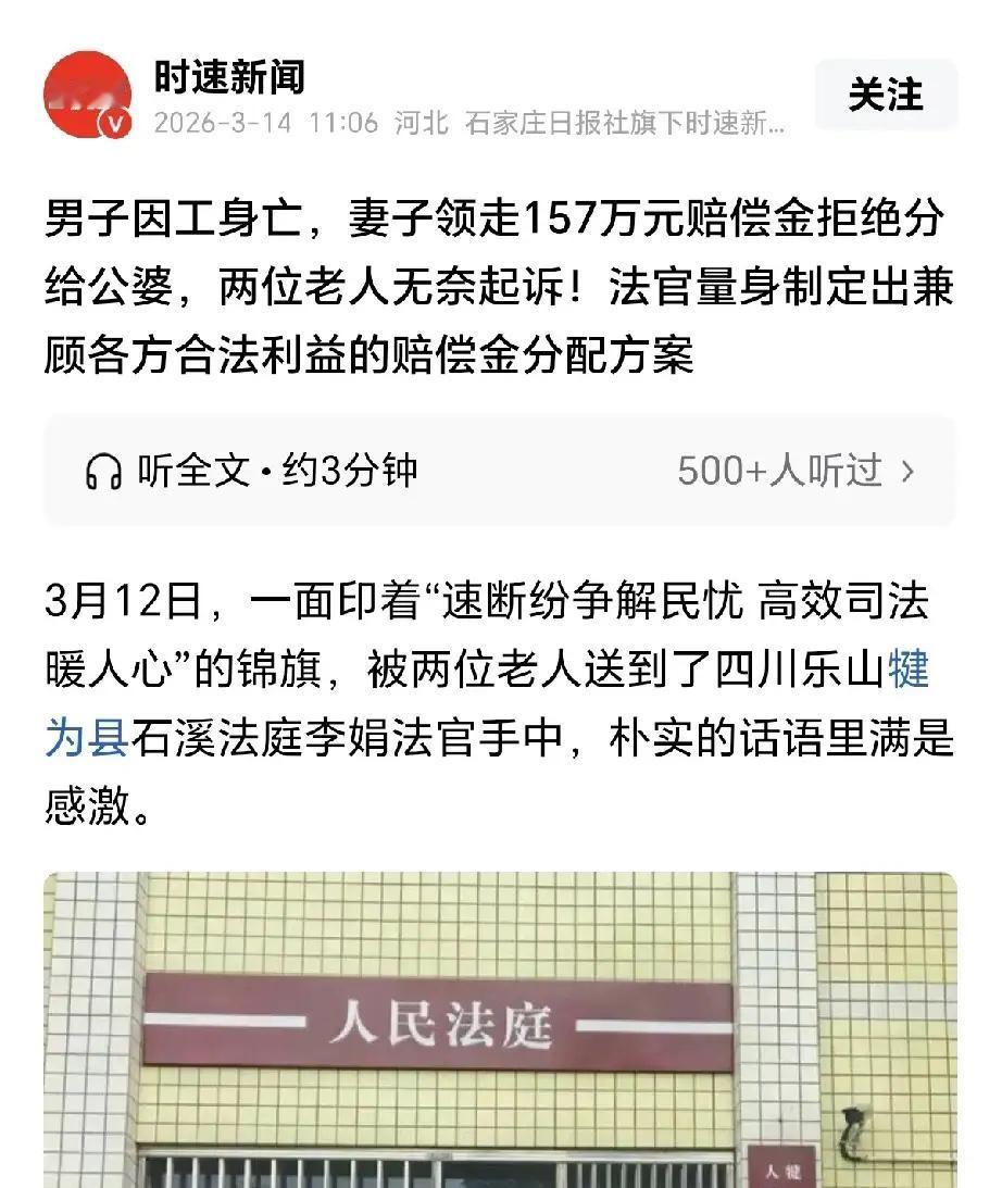“金钱再次将亲情打败!”四川乐山,一男子工伤死亡,赔偿款157万元打到妻子账上,妻子认为,这笔钱归自己和孩子所有,丈夫死亡,这是他们未来的保障,可公婆老年丧子,身体衰弱,也想分走一部分养老,公婆问儿媳要钱,儿媳一分不给,公婆告到法院,结果令人意想不到。 这事发生在乐山犍为县。2025年10月,刘某在工地上出了事,人没救回来。单位按规矩赔了157万,钱直接打到了他妻子廖某的卡里。廖某看着银行卡里的数字,心情很沉重,她想着两个还没长大的孩子,以后上学、生活,哪样不要钱?这157万,是她和孩子往后日子的全部指望。 公婆那边儿子是他们的心头肉,说没就没了。老两口年纪大了,身体一天不如一天,本来指望儿子养老送终,现在什么都没了。他们找到儿媳,提出这笔赔偿金,能不能分一点给他们,就当是儿子最后尽孝了。 廖某说这钱是丈夫用命换来的,该留给老婆和孩子。公婆还有别的子女,可以靠他们养老。话传到老人耳朵里,字字扎心。他们觉得委屈,儿子没了,连一点念想都留不下吗?几次商量不成,关系越来越僵。最后,两位老人一纸诉状,把儿媳告上了犍为县人民法院的石溪法庭。 法庭上老人说,晚年丧子,无依无靠,要钱是为了有个保障。儿媳说一个人拉扯两个孩子,未来的路看不到头,钱一分都不能动。 法官李娟接手了这个案子,她没急着判。她知道,这案子要是简单一判,钱是分清楚了,这家人的情分也就彻底断了。 她一次次找双方聊,分开谈,面对面谈。跟老人说,孙子孙女还小,正是用钱的时候,当爷爷奶奶的,也得为孩子想想。跟廖某说,老人失去了儿子,心里苦,要钱不是贪心,是求个心安,也是儿子最后能尽的孝道。 法官还耐心解释,这笔工亡赔偿金,法律上不是遗产,也不是谁领了就归谁。它是给所有近亲属的补偿,死者的配偶、子女、父母,都有份。不能因为钱在一个人手里,就变成她一个人的。 道理讲透了,心结慢慢解开了。老人想到孙子孙女,心软了。廖某看到公婆的白发和眼泪,也难受。 最后,在法官调解下,一家人坐在一起,签了协议。157万里,两位老人分得40万,已经成年的大女儿分得30万,还未成年的小儿子分得50万。剩下的,归廖某支配。两位老人和成年的大女儿,还自愿放弃了刘某其他遗产的继承权。 协议签完,钱很快到位。今年3月,两位老人给法官送去了锦旗。一场差点让亲情破碎的官司,总算有了个暖心的结局。 钱有时候像一面镜子,能照出人性最复杂的一面。站在儿媳的角度,她想守住孩子未来的生活,没有错。站在公婆的角度,他们想要一点养老的依靠和心灵的慰藉,也没有错。错就错在,灾难突然降临,悲痛和恐慌让人只顾着抓紧眼前的东西,忘了彼此还是血脉相连的一家人。 好在法官没有机械地判决,而是用情理去融化坚冰,给这个破碎的家,重新搭起一座沟通的桥。 这笔用生命换来的钱,最终没有打败亲情,反而在法律的守护下,让一家人找回了理解和体谅。它分下去的不仅是钱,更是一份对逝者的告慰,和对生者的责任。 各位读者你们怎么看?欢迎在评论区讨论。
