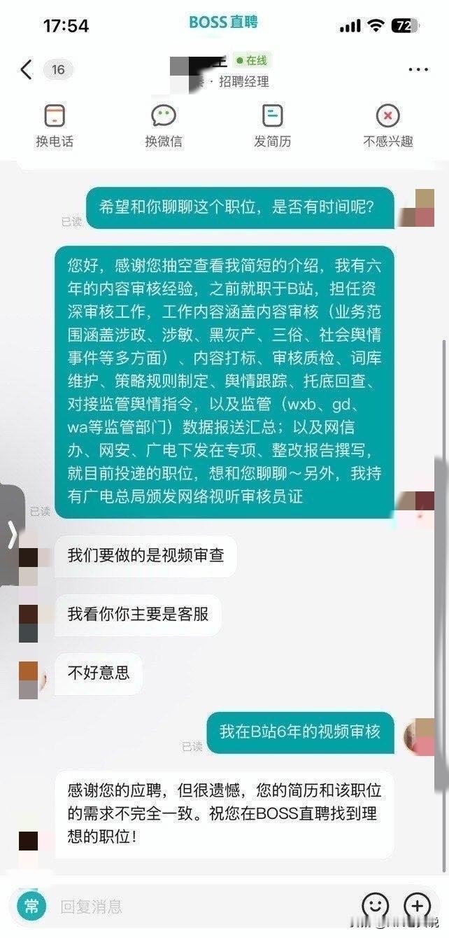 公司招视频审查,候选人有6年视频审核经验被hr“视而不见”,反而只盯着候选人的客户经历一言否定,候选人吐槽其“敷衍吐槽不尊重人,就这德行”;大家觉着这是候选人玻璃心还是hr有眼无珠? 作为一个hr,如果你要让我说,我只能说视角不同,结论不同,但是就现在的大环境下,公司有着绝对的挑选权,所以咱作为求职者,他爱说啥就说啥吧; 因为他给出的否定原因,并不一定是真实的原因,但绝对是可以说出口的原因,让你觉得气愤但是挑不出其他毛病了;反倒是一些“暗卡”,才是挂掉一个求职者的真正原因。 就比如说因为年龄,性别、地域、甚至是候选人有过仲裁,这些原因是挂掉候选人的真实原因,但是hr肯定不能直接跟你如实说不是?我不得找个其他的理由做挡箭牌嘛?! 所以如果hr否定了你,多于跟他置气,因为你置气,只会消耗自己的情绪价值,对于事情没有任何改变的!既然没有什么用,何必还生气伤自己身呢? 另外还得说一点,如果hr觉得你合适,他指定比你还上心,他会屁股后头追着你的!