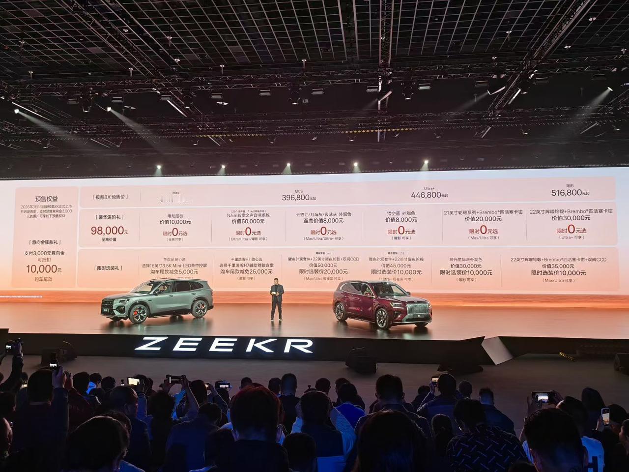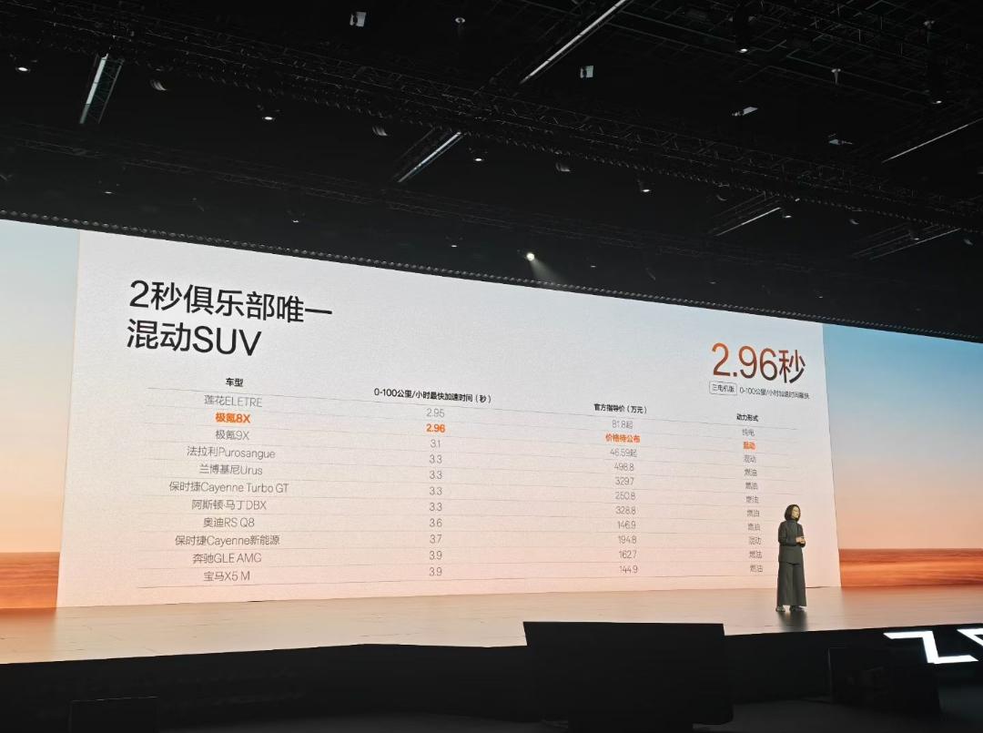 极氪8X新公路之王:灵活的操控,飞度的油耗,兰博基尼的动力,纯电车的安静! 预售价:37.68万起! -【SEP 浩瀚超级电混】2.0T超级电混发动机,145kW P1发电机,92.2%发电效率,三电机版综合功率1030kW,全域900V平台,百公里油耗不到7个。 - 70度 6C电池,纯电CLTC 410公里,综合CLTC 1416公里。 -【浩瀚AI数字底盘】闭式双腔空气悬架、双阀CCD电磁减振器、主动稳定杆 -【首发新一代千里浩瀚G-ASD辅助驾驶系统】H9方案,双NVIDIA Thor-U芯片,云端23.5EFlops算力,43颗高精度传感器,5颗激光雷达,全场景无图辅助驾驶能力。 -【浩瀚安全盔甲】105公里/小时后碰测试标准,985电池无力保护,第三代纤晶一体式压铸后端铝车身。42400nm/deg车身扭转刚度。 - 大五座超长滑轨,伊姆斯躺椅,17英寸 3K OLED吸顶屏,Naim音响系统(29扬声器,7.1.4.8沉浸式全维环绕声场)。 - 六座悦享包10000块,3000抵10000,98000豪华进阶礼,电动踏板送,音响系统送。 有钱的老板直接上矅影版,各种专属,巨拉风!【来自懂车帝车友圈】